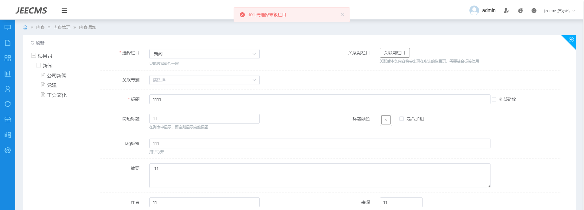 一级栏目不允许发内容吗,现在提示的是请选择末级栏目