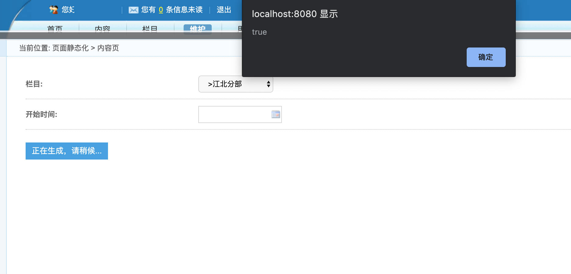 这边内容页静态化时,提示 "true" ,然后提示“该栏目未开启内容静态化,无法生成”。但该栏目但静态化已经勾选了。请问是什么问题吗?