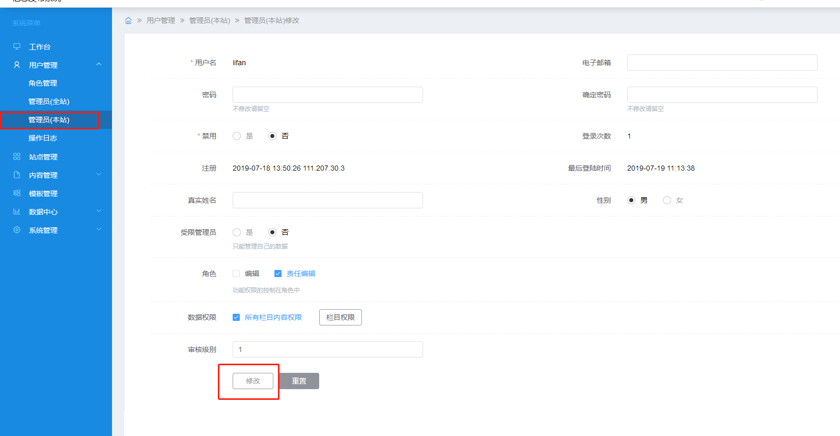 主题 : jeecms管理员(本站)为什么不能修改信息?