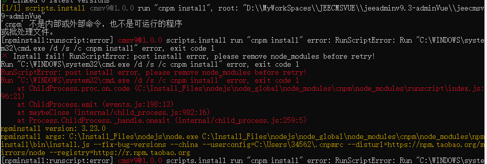 在cmd中执行vue前半段没有任何报错,后半段说cnpm不是内部命令,请版主帮我看下,我是哪里出错了,nodejs没找到8.9.3版本,用的是10.16.3版本,附件中是node版本,npm版本cnpm的情况,请版主指点一下。