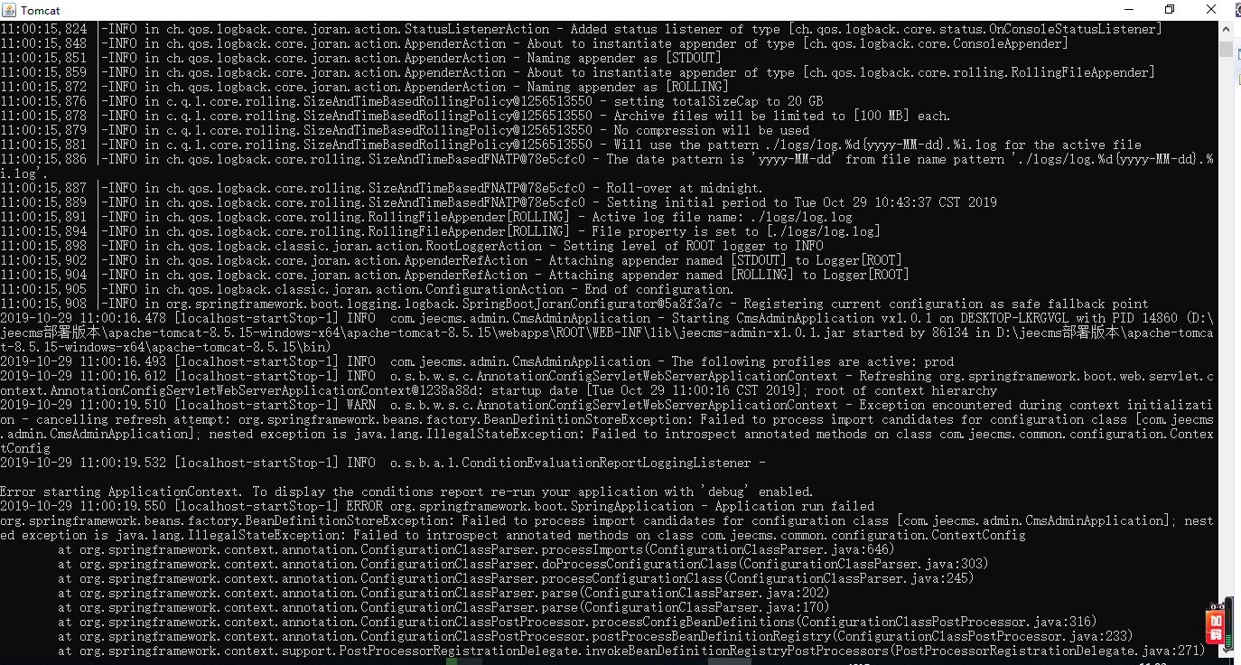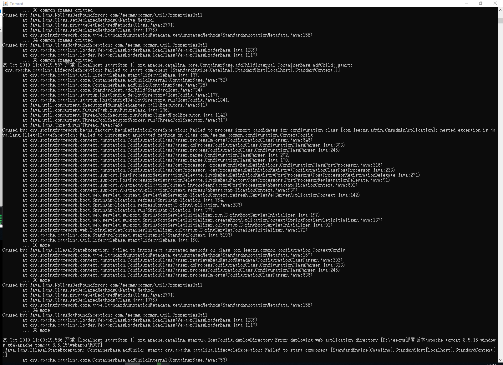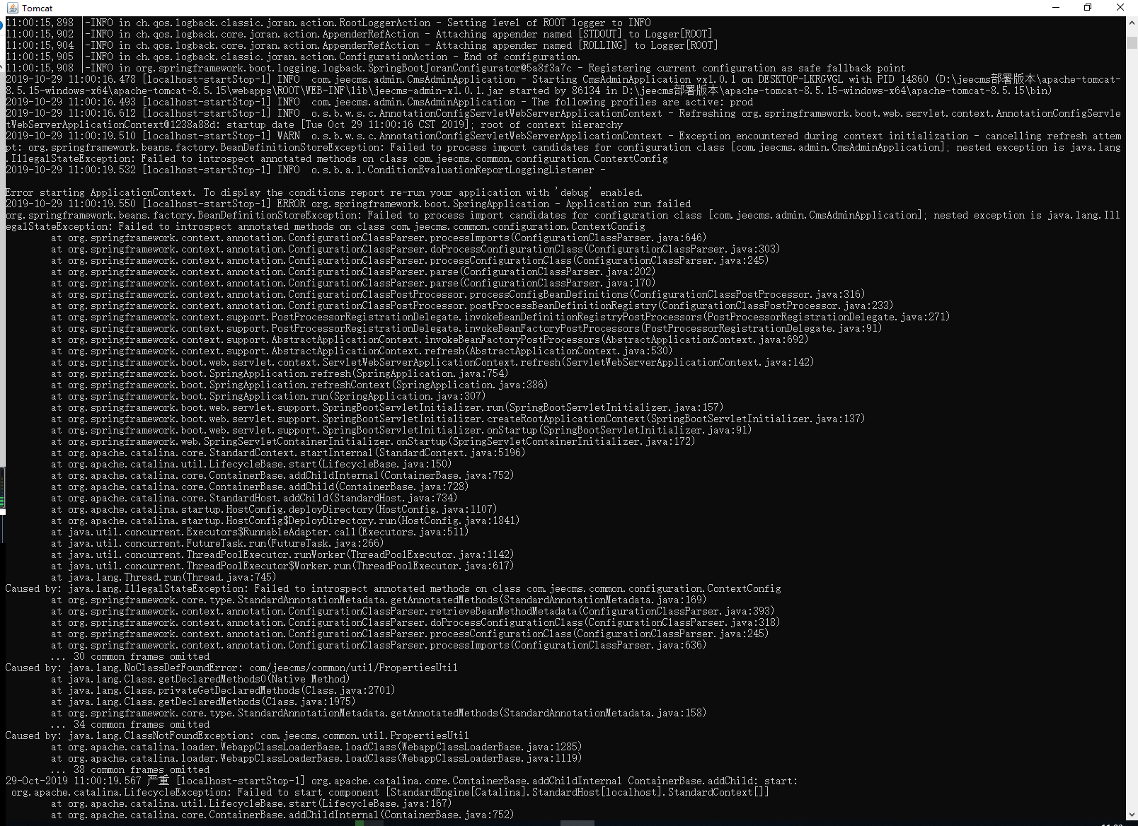 Error starting ApplicationContext. To display the conditions report re-run your application with 'debug' enabled. 2019-10-30 09:25:09.167 [localhost-startStop-2] ERROR org.springframework.boot.SpringApplication - Application run failed org.springframework.beans.factory.BeanDefinitionStoreException: Failed to process import candidates for configuration class [com.jeecms.front.CmsFrontApplication]; nested exception is java.lang.IllegalStateException: Failed to introspect annotated methods on class com.jeecms.common.configuration.ContextConfig at org.springframework.context.annotation.ConfigurationClassParser.processImports(ConfigurationClassParser.java:646) at org.springframework.context.annotation.ConfigurationClassParser.doProcessConfigurationClass(ConfigurationClassParser.java:303) at org.springframework.context.annotation.ConfigurationClassParser.processConfigurationClass(ConfigurationClassParser.java:245) at org.springframework.context.annotation.ConfigurationClassParser.parse(ConfigurationClassParser.java:202) at org.springframework.context.annotation.ConfigurationClassParser.parse(ConfigurationClassParser.java:170) at org.springframework.context.annotation.ConfigurationClassPostProcessor.processConfigBeanDefinitions(ConfigurationClassPostProcessor.java:316) at org.springframework.context.annotation.ConfigurationClassPostProcessor.postProcessBeanDefinitionRegistry(ConfigurationClassPostProcessor.java:233) at org.springframework.context.support.PostProcessorRegistrationDelegate.invokeBeanDefinitionRegistryPostProcessors(PostProcessorRegistrationDelegate.java:271) at org.springframework.context.support.PostProcessorRegistrationDelegate.invokeBeanFactoryPostProcessors(PostProcessorRegistrationDelegate.java:91) at org.springframework.context.support.AbstractApplicationContext.invokeBeanFactoryPostProcessors(AbstractApplicationContext.java:692) at org.springframework.context.support.AbstractApplicationContext.refresh(AbstractApplicationContext.java:530) at org.springframework.boot.web.servlet.context.ServletWebServerApplicationContext.refresh(ServletWebServerApplicationContext.java:142) at org.springframework.boot.SpringApplication.refresh(SpringApplication.java:754) at org.springframework.boot.SpringApplication.refreshContext(SpringApplication.java:386) at org.springframework.boot.SpringApplication.run(SpringApplication.java:307) at org.springframework.boot.web.servlet.support.SpringBootServletInitializer.run(SpringBootServletInitializer.java:157) at org.springframework.boot.web.servlet.support.SpringBootServletInitializer.createRootApplicationContext(SpringBootServletInitializer.java:137) at org.springframework.boot.web.servlet.support.SpringBootServletInitializer.onStartup(SpringBootServletInitializer.java:91) at org.springframework.web.SpringServletContainerInitializer.onStartup(SpringServletContainerInitializer.java:172) at org.apache.catalina.core.StandardContext.startInternal(StandardContext.java:5196) at org.apache.catalina.util.LifecycleBase.start(LifecycleBase.java:150) at org.apache.catalina.core.ContainerBase.addChildInternal(ContainerBase.java:752) at org.apache.catalina.core.ContainerBase.addChild(ContainerBase.java:728) at org.apache.catalina.core.StandardHost.addChild(StandardHost.java:734) at org.apache.catalina.startup.HostConfig.deployWAR(HostConfig.java:952) at org.apache.catalina.startup.HostConfig$DeployWar.run(HostConfig.java:1823) at java.util.concurrent.Executors$RunnableAdapter.call(Executors.java:511) at java.util.concurrent.FutureTask.run(FutureTask.java:266) at java.util.concurrent.ThreadPoolExecutor.runWorker(ThreadPoolExecutor.java:1142) at java.util.concurrent.ThreadPoolExecutor$Worker.run(ThreadPoolExecutor.java:617) at java.lang.Thread.run(Thread.java:745) Caused by: java.lang.IllegalStateException: Failed to introspect annotated methods on class com.jeecms.common.configuration.ContextConfig at org.springframework.core.type.StandardAnnotationMetadata.getAnnotatedMethods(StandardAnnotationMetadata.java:169) at org.springframework.context.annotation.ConfigurationClassParser.retrieveBeanMethodMetadata(ConfigurationClassParser.java:393) at org.springframework.context.annotation.ConfigurationClassParser.doProcessConfigurationClass(ConfigurationClassParser.java:318) at org.springframework.context.annotation.ConfigurationClassParser.processConfigurationClass(ConfigurationClassParser.java:245) at org.springframework.context.annotation.ConfigurationClassParser.processImports(ConfigurationClassParser.java:636) ... 30 common frames omitted Caused by: java.lang.NoClassDefFoundError: com/jeecms/common/util/PropertiesUtil at java.lang.Class.getDeclaredMethods0(Native Method) at java.lang.Class.privateGetDeclaredMethods(Class.java:2701) at java.lang.Class.getDeclaredMethods(Class.java:1975) at org.springframework.core.type.StandardAnnotationMetadata.getAnnotatedMethods(StandardAnnotationMetadata.java:158) ... 34 common frames omitted Caused by: java.lang.ClassNotFoundException: com.jeecms.common.util.PropertiesUtil at org.apache.catalina.loader.WebappClassLoaderBase.loadClass(WebappClassLoaderBase.java:1285) at org.apache.catalina.loader.WebappClassLoaderBase.loadClass(WebappClassLoaderBase.java:1119) ... 38 common frames omitted 30-Oct-2019 09:25:09.177 严重 [localhost-startStop-2] org.apache.catalina.core.ContainerBase.addChildInternal ContainerBase.addChild: start: org.apache.catalina.LifecycleException: Failed to start component [StandardEngine[Catalina].StandardHost[localhost].StandardContext[/ROOT123]] at org.apache.catalina.util.LifecycleBase.start(LifecycleBase.java:167) at org.apache.catalina.core.ContainerBase.addChildInternal(ContainerBase.java:752) at org.apache.catalina.core.ContainerBase.addChild(ContainerBase.java:728) at org.apache.catalina.core.StandardHost.addChild(StandardHost.java:734) at org.apache.catalina.startup.HostConfig.deployWAR(HostConfig.java:952) at org.apache.catalina.startup.HostConfig$DeployWar.run(HostConfig.java:1823) at java.util.c