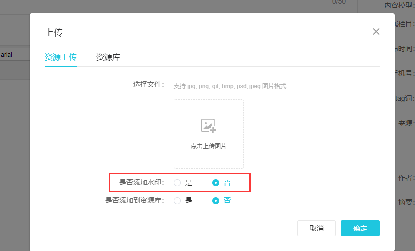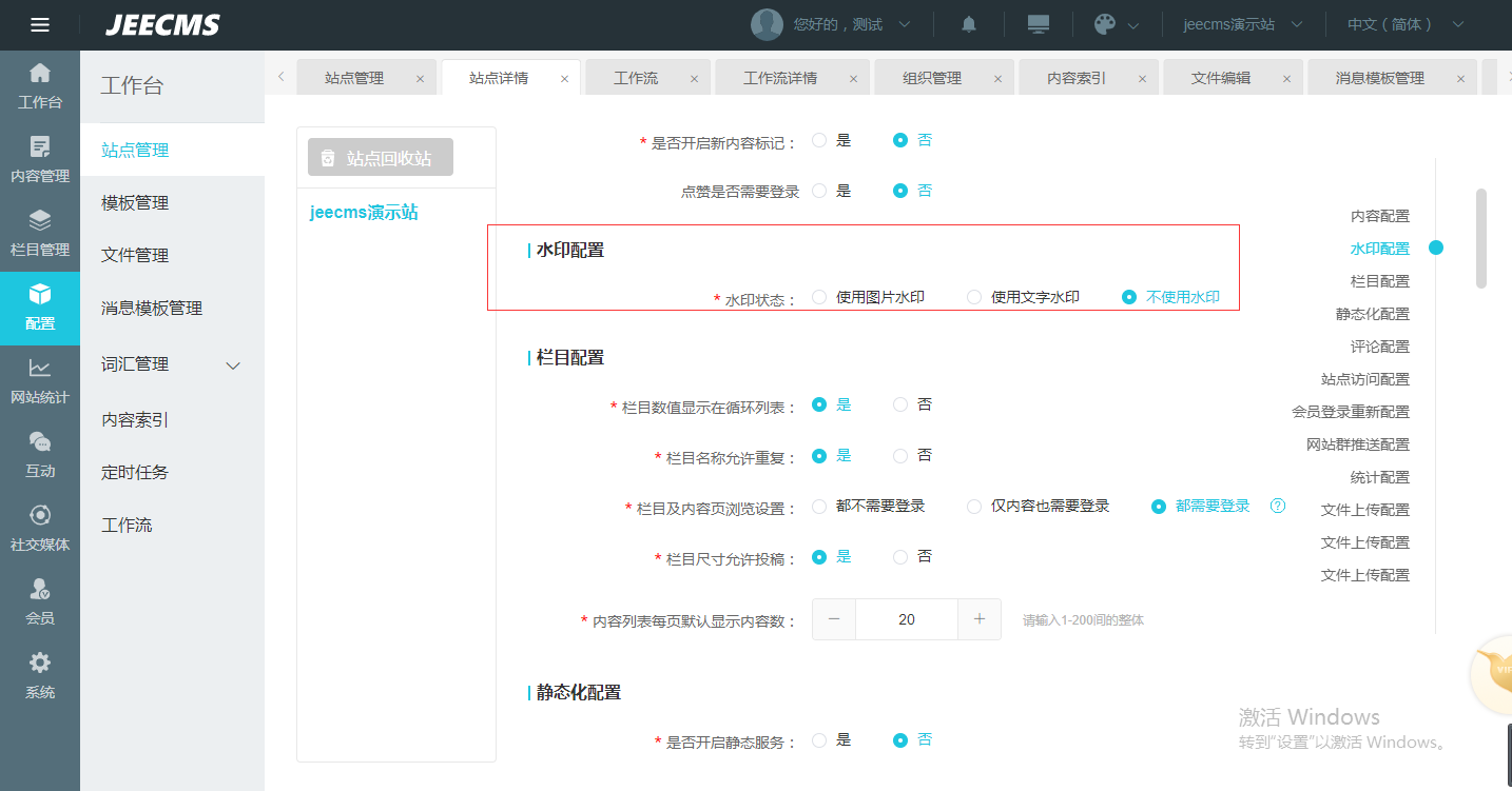 后台上传新闻,或者其他资讯的时候,可以点击上传图片,是否添加水印,这个水印的配置是否可以修改,目前添加完水印后  右下角显示jeecms