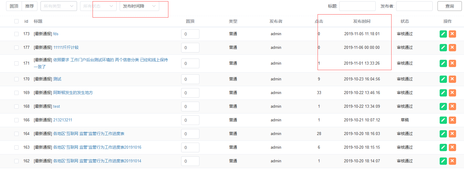 我看了一下,它是按左侧的排序时间倒序排的,并没有按照发布时间排序, orderBy='2',这个是按照发布时间排吗 还有我页面中的排序也是排序时间,这个需要改哪,才会变成发布时间 |