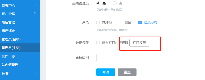 限制只能管理其中一个,但是选择框选择栏目的时候能选择到其他的栏目