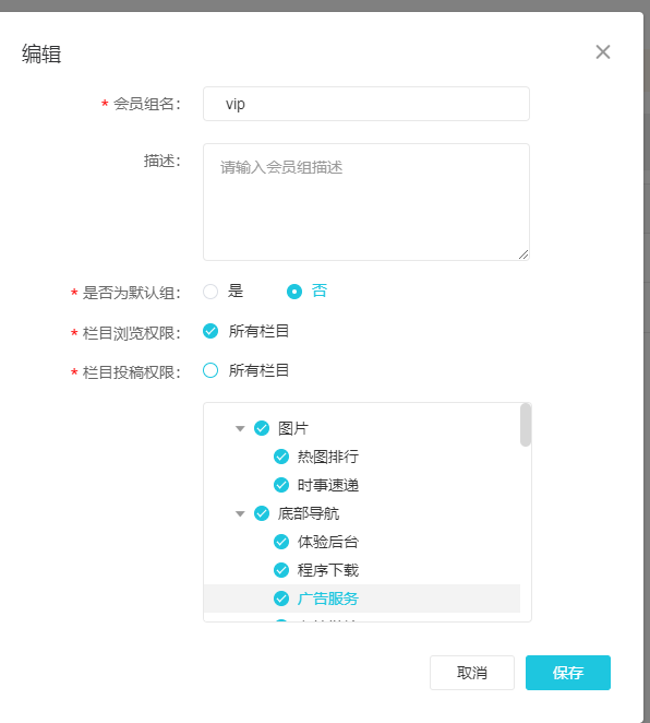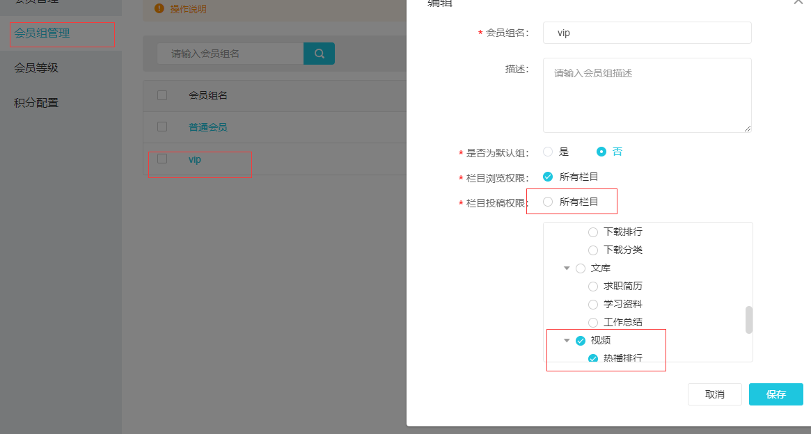 回复第3楼 可能你没理解我的意思,比如我把所有栏目的投稿权限付给vip组,vip组的会员在我要投稿的栏目选择中就有全部,但是我选择性赋予投稿栏目权限,就为空了.