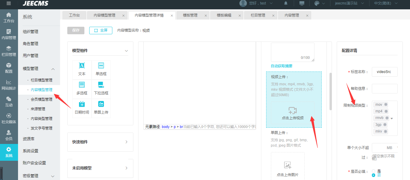您可以去对应的内容字段下看下他是否可以上传对应的文件类型    我给您截图下吧