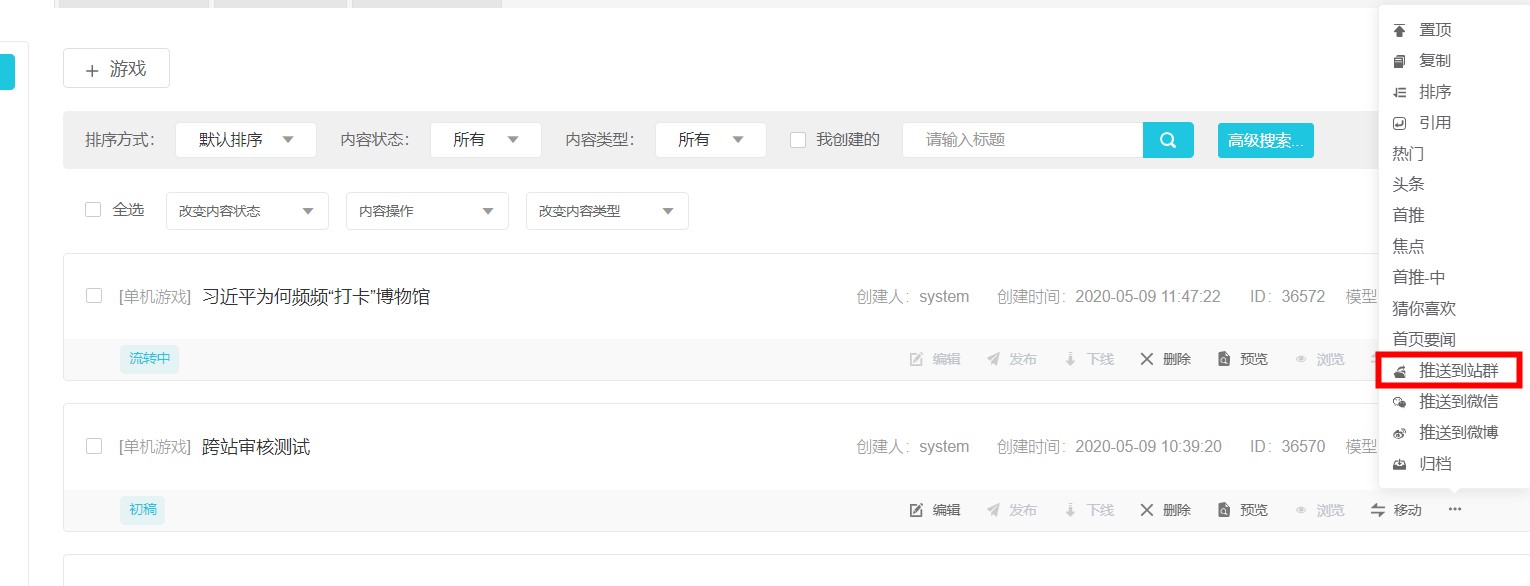 嗯!但是我测试的结果是不在流转中的状态都有这个问题!就是只要主站点和子站点的栏目配置了工作流,对应的内容推送就会有问题(推送没有意义,审核和发布不了)
