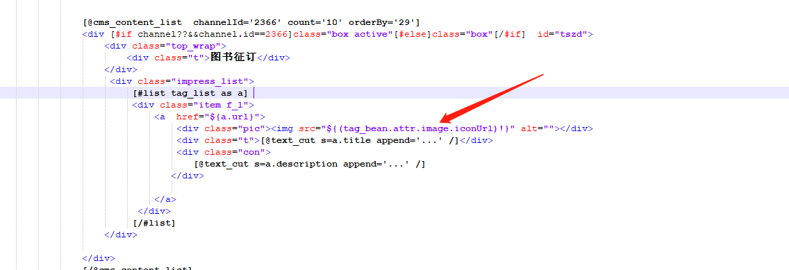 你说的这个自定义标签,怎么用? [@cms_content_list channelId='2366' count='10' orderBy='29'] <div [#if channel??&&channel.id==2366]class="box active"[#else]class="box"[/#if] id="tszd"> <div class="top_wrap"> <div class="t">图书征订</div> </div> <div class="impress_list"> [#list tag_list as a] <div class="item f_l"> <a href="${a.url}"> <div class="pic"><img src="${a.iconUrl!}" alt=""></div> <div class="t">[@text_cut s=a.title append='...' /]</div> <div class="con"> [@text_cut s=a.description append='...' /] </div> </a> </div> [/#list] </div> </div> [/@cms_content_list] |