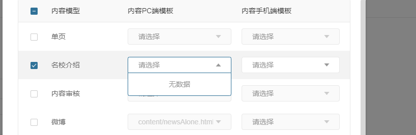 他这个在模板里要去配置适配的内容模型的 配置后才能在对应的内容模型下选择到模板内容