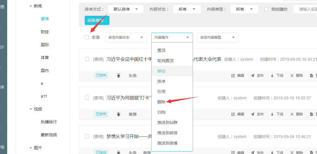 回复第4楼 再问一个问题,内容管理里面没有批量删除的功能吗,我点选的全选,没有出来相关的操作按钮