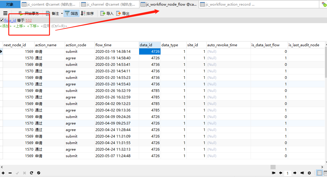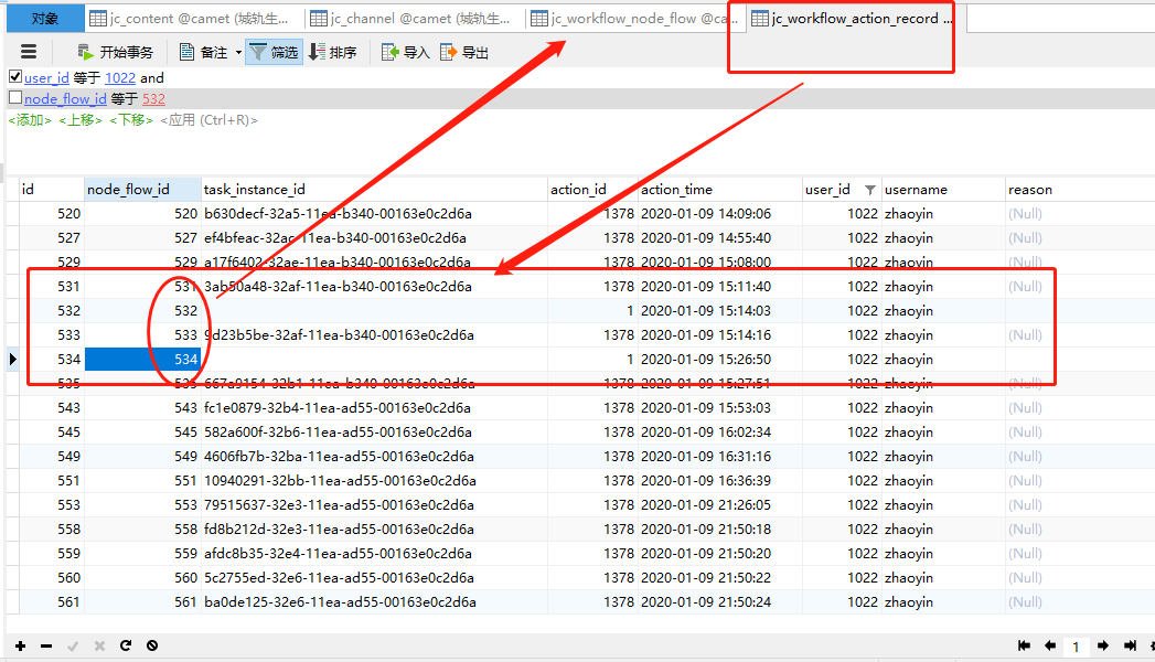 嗯,这两个表我看了,从 jc_workflow_action_record 这个表里能看见两条异常数据,但是 用 flow_id 去jc_workflow_node_flow 这个表里查的时候,有很多,我不敢随便处理啊