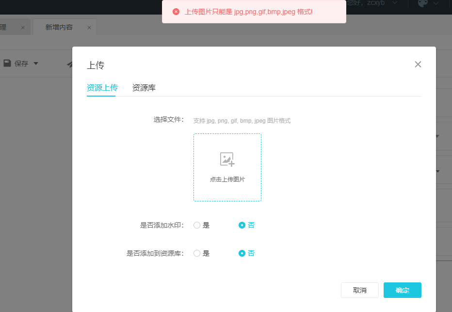请问使用过程中,新增内容碰到jpg图片不能上传的问题,是什么情况啊 |