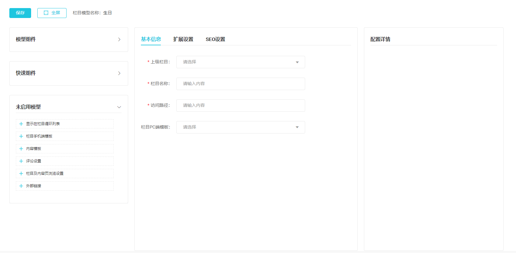 去您需要配置的模板的编辑界面在右上角有个模型关联的功能的