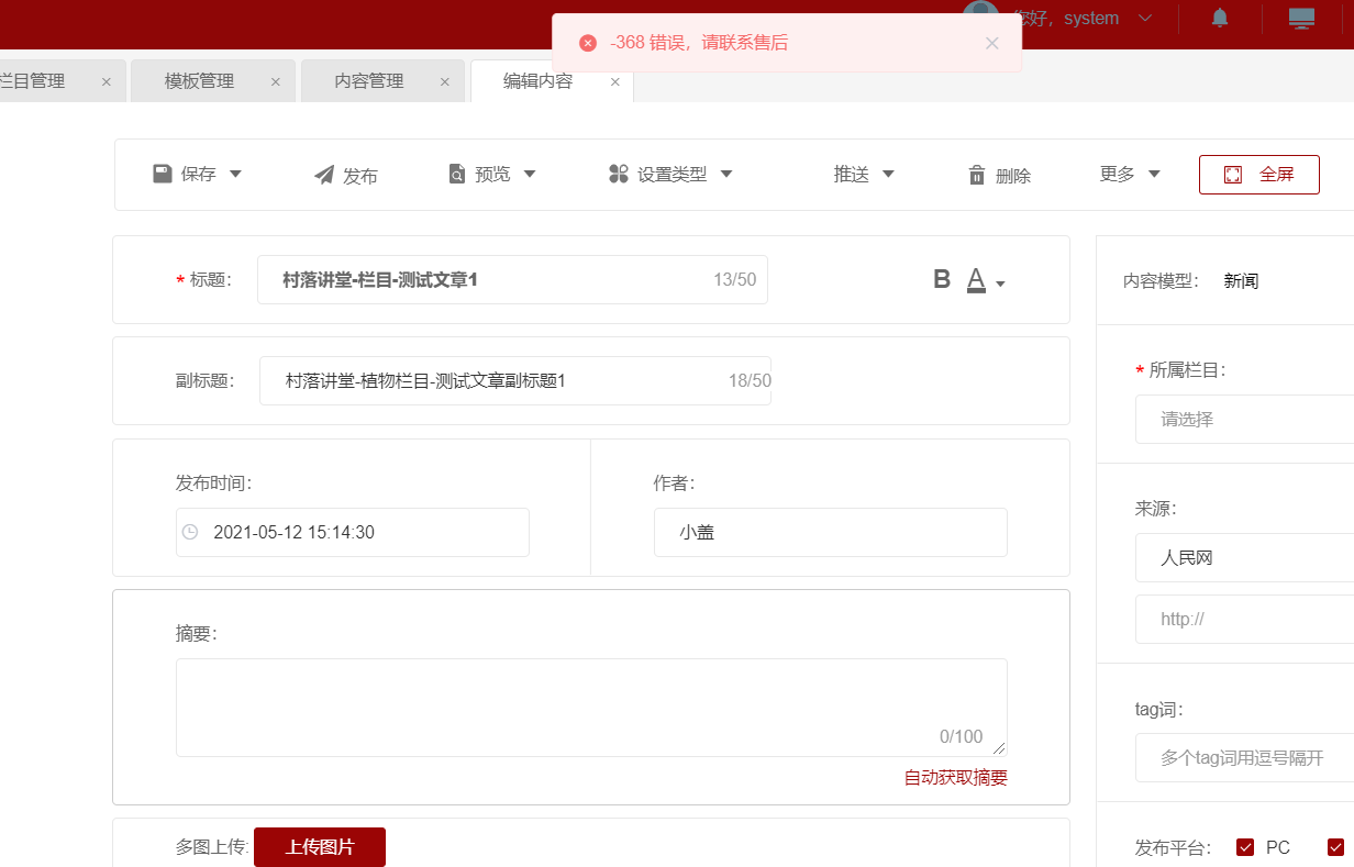 您好,您使用的是什么版本。是栏目发布内容编辑完发布后后台弹出-368错误?