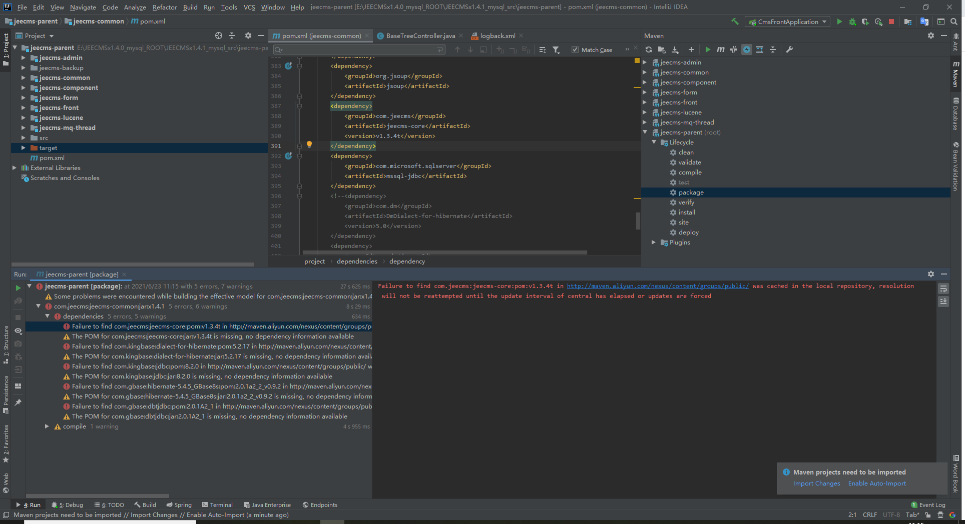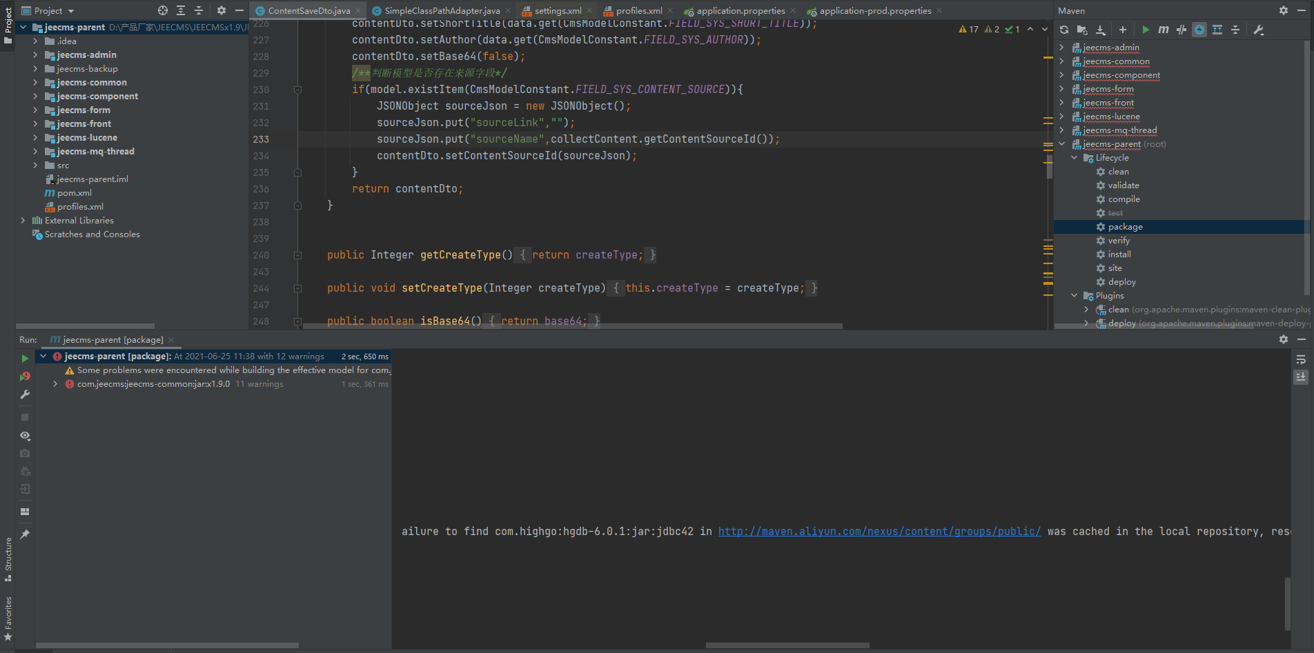 用的是 开源版源码,idea 运行的时候 没问题。 但打包报 Failure to find com.jeecms:jeecms-core:pom:v1.3.4t in http://maven.aliyun.com/nexus/content/groups/public/ was cached in the local repository, resolution will not be reattempted until the update interval of central has elapsed or updates are forced 看之前的帖子说 开源的 不需要这个jar包,注释掉 就行。 但注释掉 运行报错,死循环了。 |