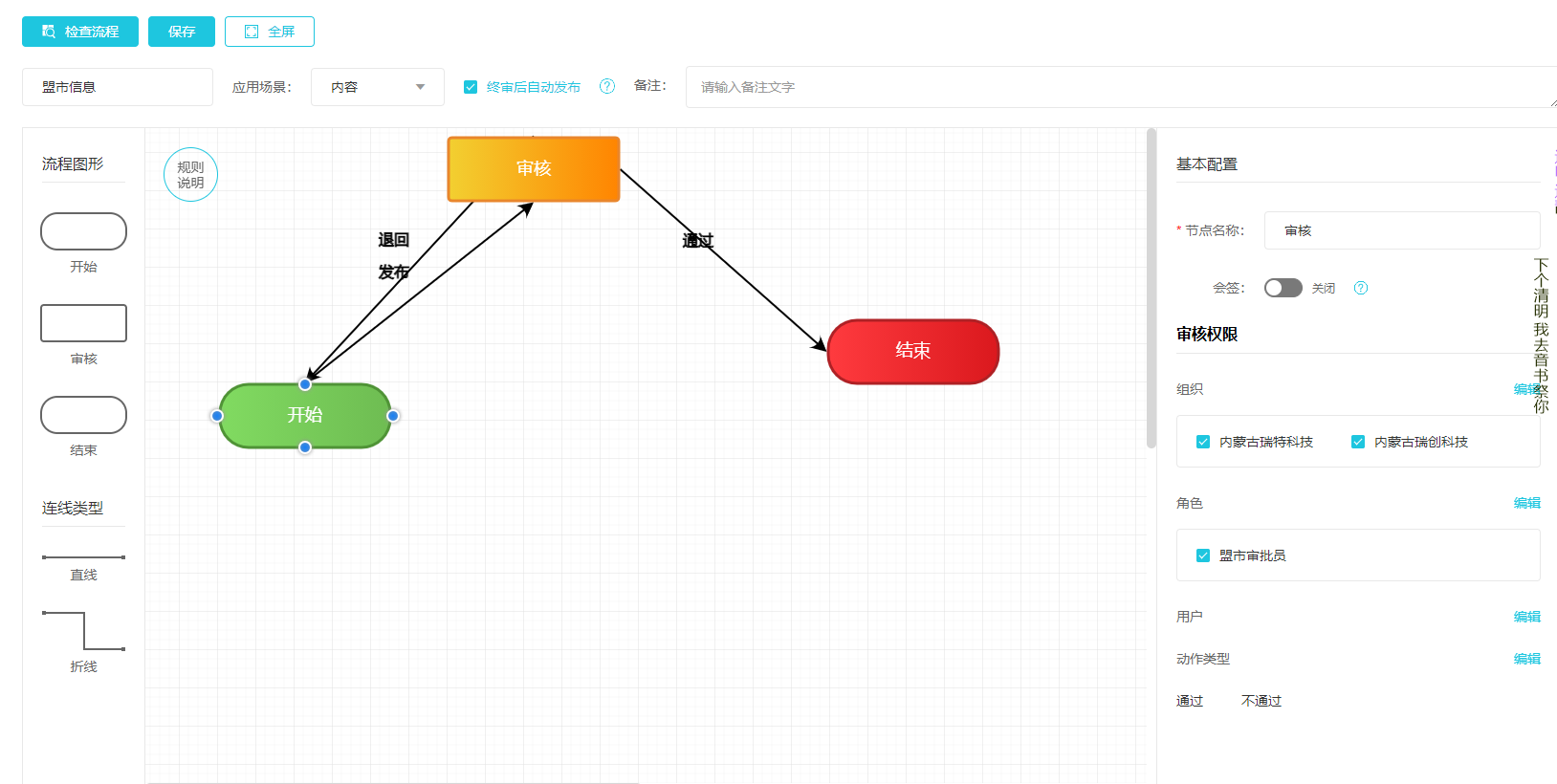 例如 我先建立 信息发布角色,文章审批角色 在建立4个账户,test1|test2|test13|test24 1. 上海 、杭州 分别有个信息发布人,上海信息发布人tset1 |杭州信息发布人test2。他们分配,信息发布角色 2.然后 我建立 在将上海信息审批人 test13 ,杭州信息审批人 test24,他们分配,文章审批角色 现在需求是: 上海信息发布人tset1 发布的新闻,想让 test13 看到 不想让其他省份的人看到 --------------------------------------------------------------- 就是这个流程应该怎么配呢,我这是简单说了一下,实际中,是好多信息发布人及审批人,流程不能直接指定人吧,直接指定的话,这种流程就成多个了,咱这个流程里面,因为信息发布人看到的内容栏目及内容模块都是一样的,所以栏目的流程都是用的一样的。 咱的流程里面的 配的机构,不是自动寻找,信息发布人 对应组织的 信息审批人吗? 请问我这个需求的内容发布应该怎么配置呢! ![]() |