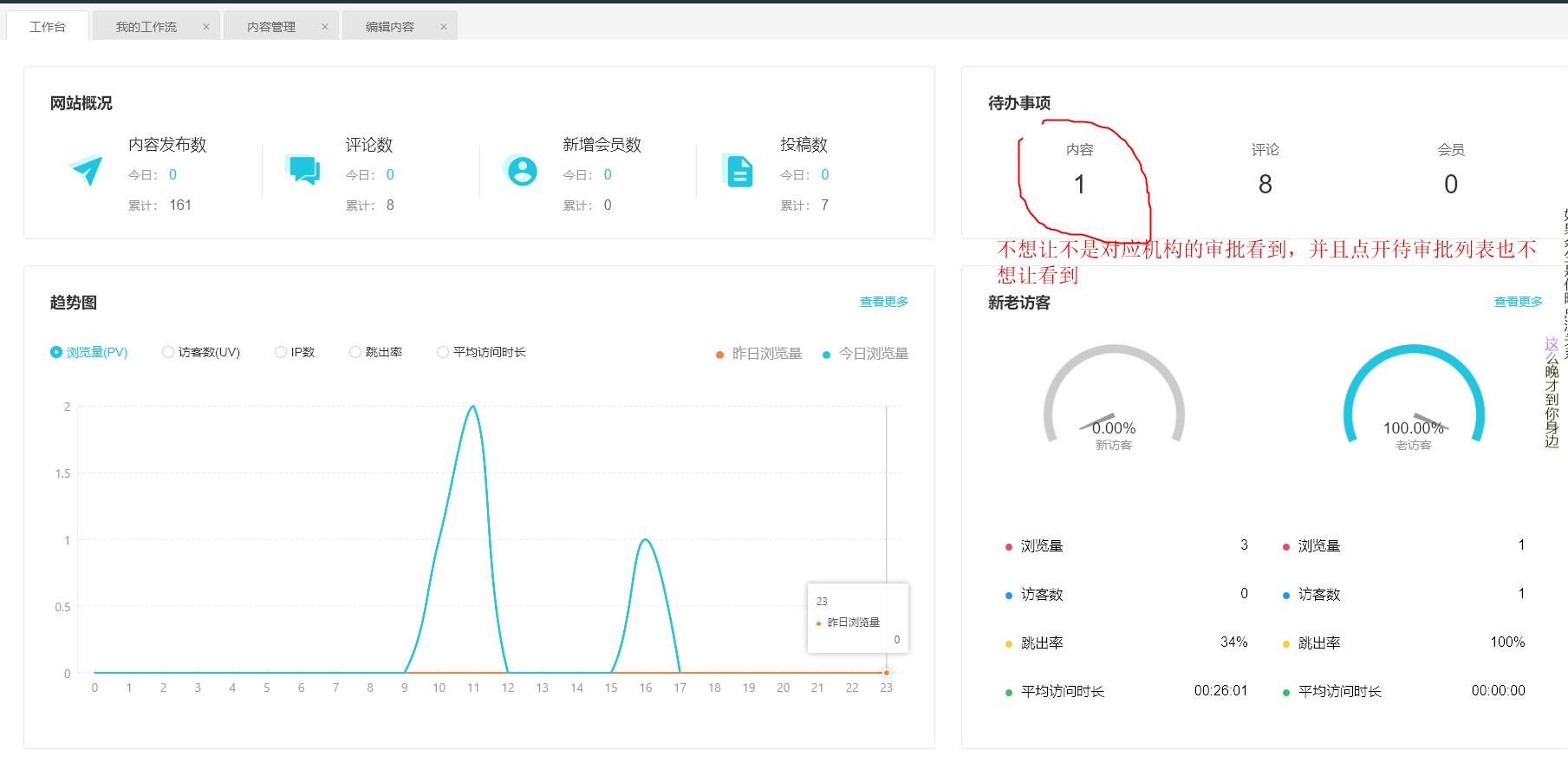 回复第9楼主要就是审批流程,待审批的文章,只想让对应机构的 审批人 看到待审批的文章 不属于和创建人一样对应机构,首页的待办,待审批不想让他看到,咱这个实现不了么?
