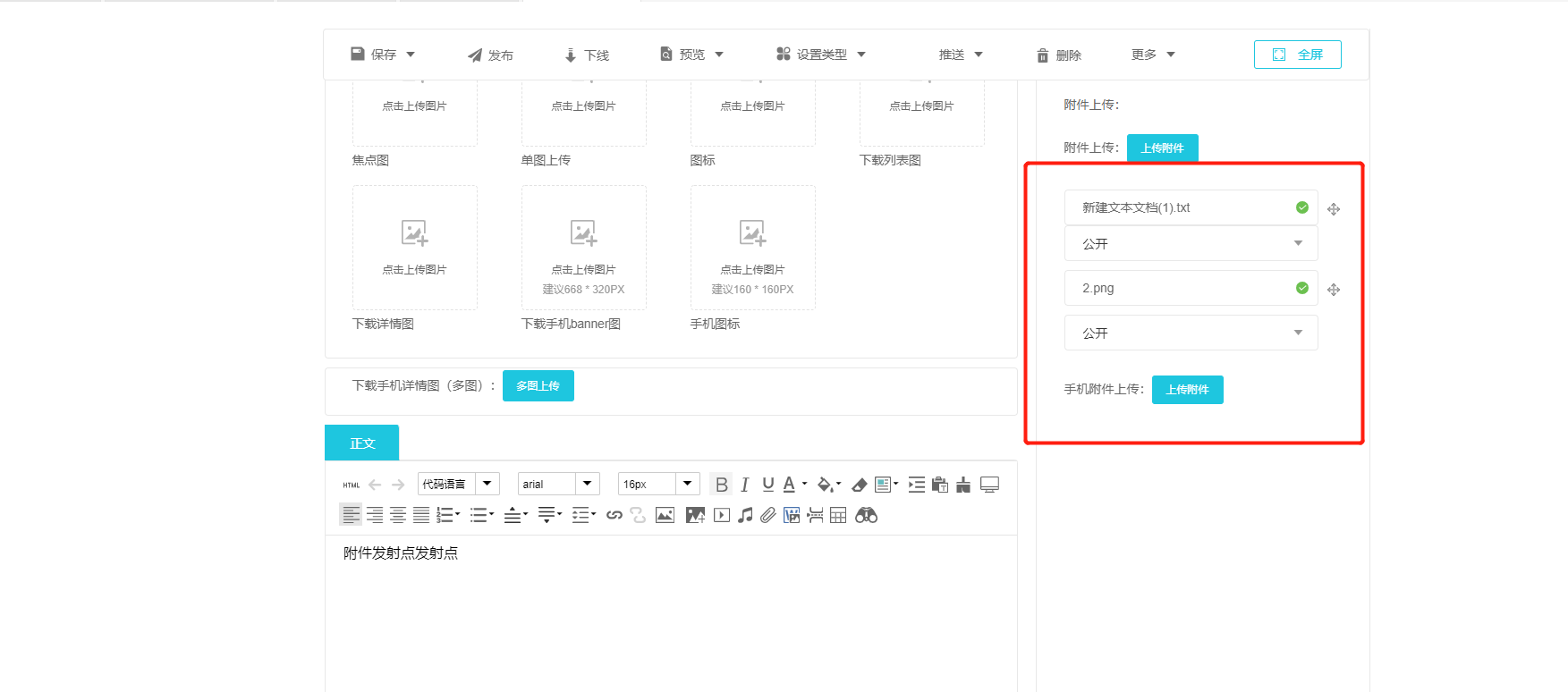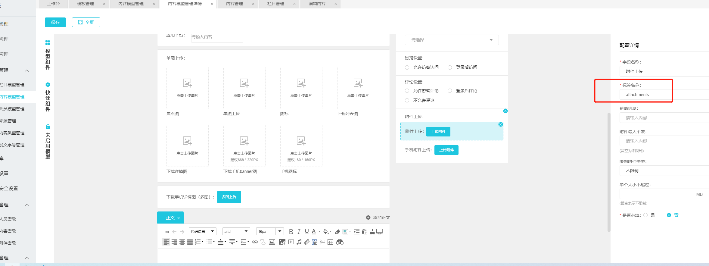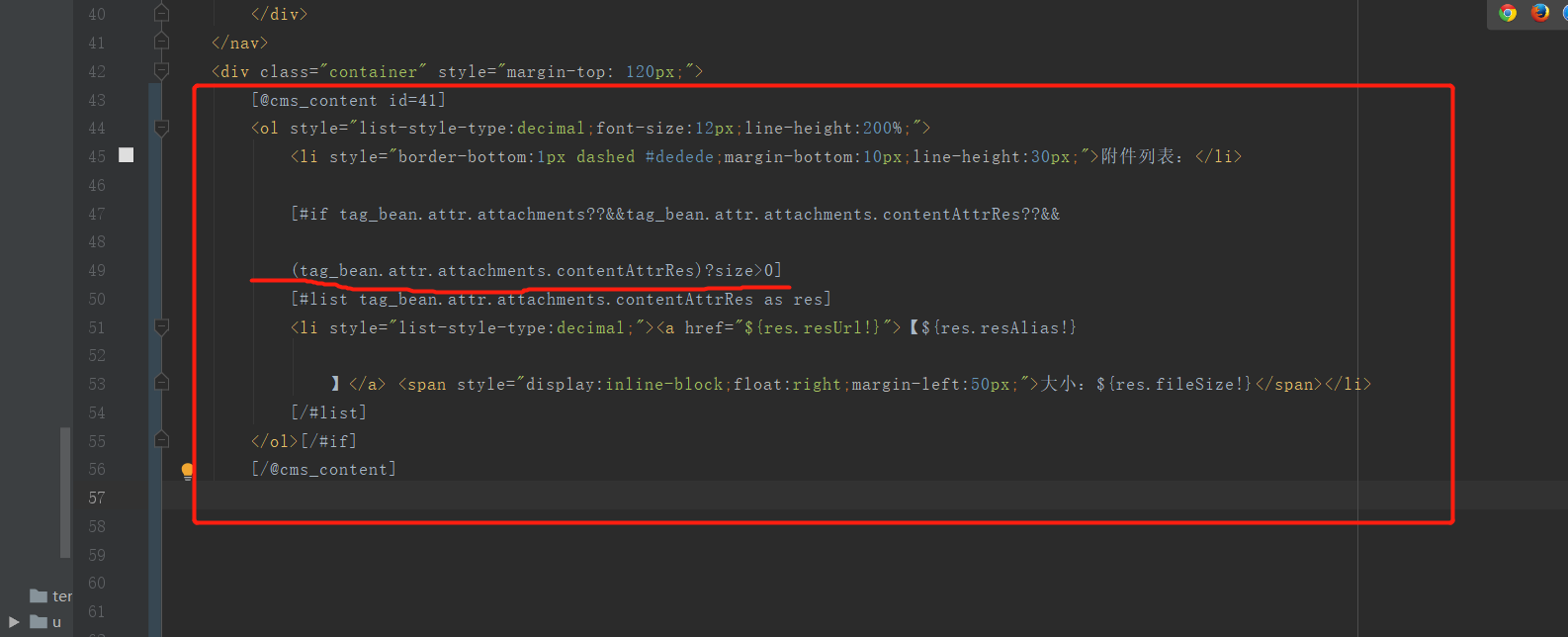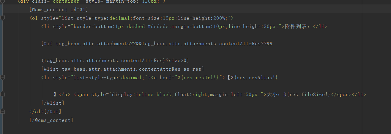 [@cms_content id=content.id] <ol style="list-style-type:decimal;font-size:12px;line-height:200%;"> <li style="border-bottom:1px dashed #dedede;margin-bottom:10px;line- height:30px;">附件列表:</li> [#if tag_bean.attr.attachments??&&tag_bean.attr.attachments.contentAttrRes??&& (tag_bean.attr.attachments.contentAttrRes)?size>0] [#list tag_bean.attr.attachments.contentAttrRes as res] <li style="list-style-type:decimal;"><a href="${res.resUrl!}">【${res.resAlias!} 】</a> <span style="display:inline-block;float:right;margin-left:50px;">大小:${res.fileSize!}</span></li> [/#list] </ol>[/#if] [/@cms_content] |