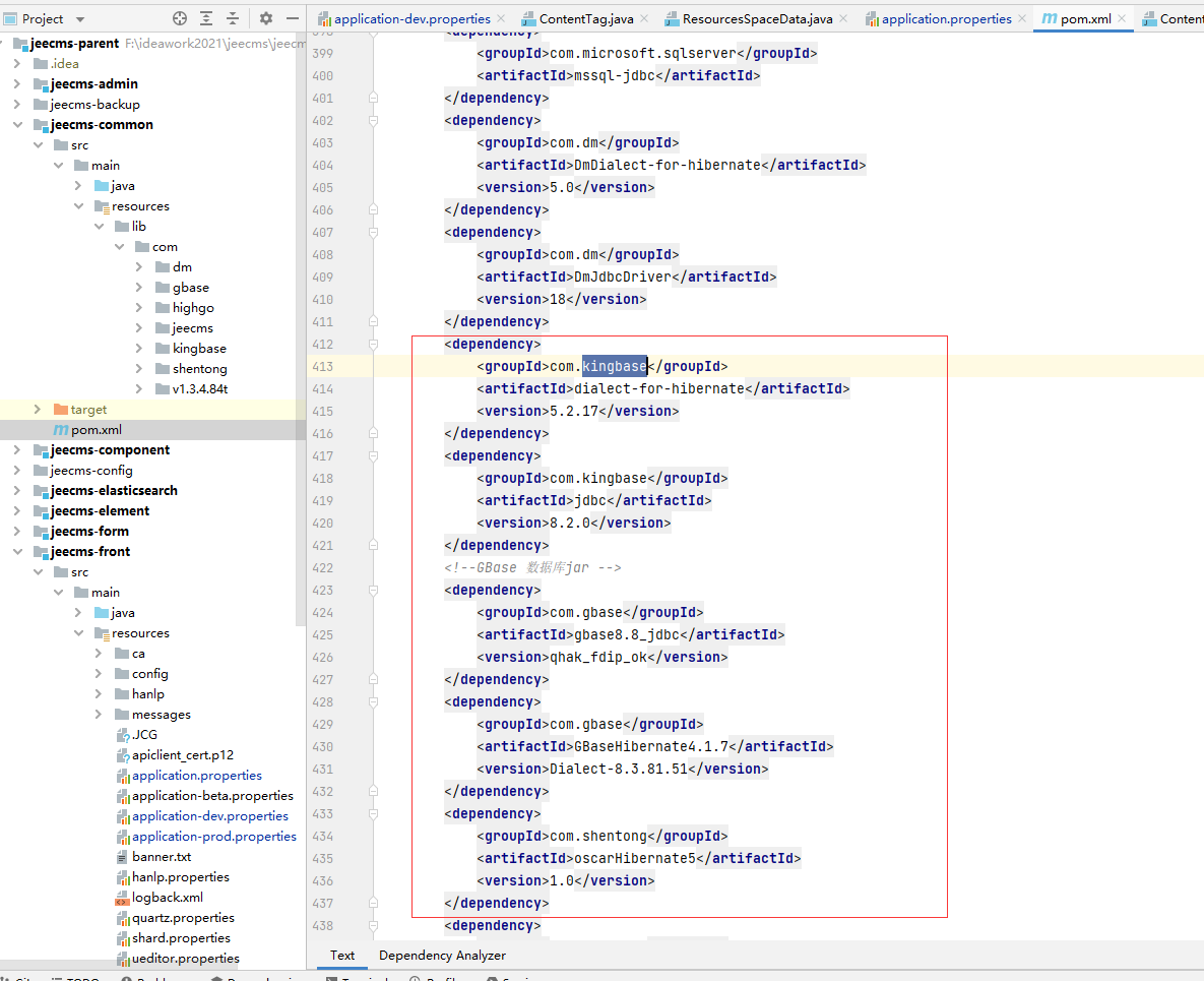 开源版本:jeecmsx1.10.0 打包时报错日志,导致放到tomcat运行也是error in opening zip file [ERROR] 读取/Users/haojie/Environment/apache-maven-3.8.1/maven-repo/com/kingbase/dialect-for-hibernate/5.2.17/dialect-for-hibernate-5.2.17.jar时出错; error in opening zip file [ERROR] 读取/Users/haojie/Environment/apache-maven-3.8.1/maven-repo/com/kingbase/dialect-for-hibernate/5.2.17/dialect-for-hibernate-5.2.17.jar时出错; error in opening zip file /Library/Java/JavaVirtualMachines/jdk1.8.0_291.jdk/Contents/Home/bin/java -Dmaven.multiModuleProjectDirectory=/Users/haojie/IdeaProjects/detention/jeecms-parent -Dmaven.home=/Applications/IntelliJ IDEA.app/Contents/plugins/maven/lib/maven3 -Dclassworlds.conf=/Applications/IntelliJ IDEA.app/Contents/plugins/maven/lib/maven3/bin/m2.conf -Dmaven.ext.class.path=/Applications/IntelliJ IDEA.app/Contents/plugins/maven/lib/maven-event-listener.jar -javaagent:/Applications/IntelliJ IDEA.app/Contents/lib/idea_rt.jar=53912:/Applications/IntelliJ IDEA.app/Contents/bin -Dfile.encoding=UTF-8 -classpath /Applications/IntelliJ IDEA.app/Contents/plugins/maven/lib/maven3/boot/plexus-classworlds.license:/Applications/IntelliJ IDEA.app/Contents/plugins/maven/lib/maven3/boot/plexus-classworlds-2.6.0.jar org.codehaus.classworlds.Launcher -Didea.version=2021.1.2 -s /Users/haojie/Environment/apache-maven-3.8.1/conf/settings.xml -Dmaven.repo.local=/Users/haojie/Environment/apache-maven-3.8.1/maven-repo -DskipTests=true package [INFO] Scanning for projects... [WARNING] [WARNING] Some problems were encountered while building the effective model for com.jeecms:jeecms-component:jar:x1.10.0 [WARNING] 'dependencies.dependency.version' for org.jetbrains:annotations:jar is either LATEST or RELEASE (both of them are being deprecated) @ line 41, column 22 [WARNING] [WARNING] It is highly recommended to fix these problems because they threaten the stability of your build. [WARNING] [WARNING] For this reason, future Maven versions might no longer support building such malformed projects. [WARNING] [INFO] ------------------------------------------------------------------------ [INFO] Reactor Build Order: [INFO] [INFO] jeecms-parent [pom] [INFO] jeecms-common [jar] [INFO] jeecms-component [jar] [INFO] jeecms-mq-thread [jar] [INFO] jeecms-lucene [jar] [INFO] jeecms-admin [jar] [INFO] jeecms-form [jar] [INFO] jeecms-front [war] [INFO] [INFO] ----------------------< com.jeecms:jeecms-parent >---------------------- [INFO] Building jeecms-parent x1.10.0 [1/8] [INFO] --------------------------------[ pom ]--------------------------------- [INFO] [INFO] ----------------------< com.jeecms:jeecms-common >---------------------- [INFO] Building jeecms-common x1.10.0 [2/8] [INFO] --------------------------------[ jar ]--------------------------------- [WARNING] The POM for com.dm:DmDialect-for-hibernate:jar:5.0 is invalid, transitive dependencies (if any) will not be available, enable debug logging for more details [WARNING] The POM for com.dm:DmJdbcDriver:jar:18 is invalid, transitive dependencies (if any) will not be available, enable debug logging for more details [WARNING] The POM for com.kingbase:dialect-for-hibernate:jar:5.2.17 is invalid, transitive dependencies (if any) will not be available, enable debug logging for more details [INFO] [INFO] --- maven-resources-plugin:3.0.2:resources (default-resources) @ jeecms-common --- [INFO] Using 'UTF-8' encoding to copy filtered resources. [INFO] Copying 0 resource [INFO] [INFO] --- maven-compiler-plugin:3.7.0:compile (default-compile) @ jeecms-common --- Downloading from aliyunmaven: https://maven.aliyun.com/repository/spring/org/apache/maven/shared/maven-shared-utils/3.1.0/maven-shared-utils-3.1.0.pom Downloaded from aliyunmaven: https://maven.aliyun.com/repository/spring/org/apache/maven/shared/maven-shared-utils/3.1.0/maven-shared-utils-3.1.0.pom (0 B at 0 B/s) Downloading from aliyunmaven: https://maven.aliyun.com/repository/spring/org/apache/maven/shared/maven-shared-incremental/1.1/maven-shared-incremental-1.1.pom Downloaded from aliyunmaven: https://maven.aliyun.com/repository/spring/org/apache/maven/shared/maven-shared-incremental/1.1/maven-shared-incremental-1.1.pom (0 B at 0 B/s) Downloading from aliyunmaven: https://maven.aliyun.com/repository/spring/org/apache/maven/maven-core/2.2.1/maven-core-2.2.1.pom Downloaded from aliyunmaven: https://maven.aliyun.com/repository/spring/org/apache/maven/maven-core/2.2.1/maven-core-2.2.1.pom (0 B at 0 B/s) Downloading from aliyunmaven: https://maven.aliyun.com/repository/spring/org/apache/maven/maven-plugin-parameter-documenter/2.2.1/maven-plugin-parameter-documenter-2.2.1.pom Downloaded from aliyunmaven: https://maven.aliyun.com/repository/spring/org/apache/maven/maven-plugin-parameter-documenter/2.2.1/maven-plugin-parameter-documenter-2.2.1.pom (0 B at 0 B/s) Downloading from aliyunmaven: https://maven.aliyun.com/repository/spring/org/slf4j/slf4j-jdk14/1.5.6/slf4j-jdk14-1.5.6.pom Downloaded from aliyunmaven: https://maven.aliyun.com/repository/spring/org/slf4j/slf4j-jdk14/1.5.6/slf4j-jdk14-1.5.6.pom (0 B at 0 B/s) Downloading from aliyunmaven: https://maven.aliyun.com/repository/spring/org/slf4j/slf4j-parent/1.5.6/slf4j-parent-1.5.6.pom Downloaded from aliyunmaven: https://maven.aliyun.com/repository/spring/org/slf4j/slf4j-parent/1.5.6/slf4j-parent-1.5.6.pom (0 B at 0 B/s) Downloading from aliyunmaven: https://maven.aliyun.com/repository/spring/org/slf4j/slf4j-api/1.5.6/slf4j-api-1.5.6.pom Downloaded from aliyunmaven: https://maven.aliyun.com/repository/spring/org/slf4j/slf4j-api/1.5.6/slf4j-api-1.5.6.pom (0 B at 0 B/s) Downloading from aliyunmaven: https://maven.aliyun.com/repository/spring/org/slf4j/jcl-over-slf4j/1.5.6/jcl-over-slf4j-1.5.6.pom Downloaded from aliyunmaven: https://maven.aliyun.com/repository/spring/org/slf4j/jcl-over-slf4j/1.5.6/jcl-over-slf4j-1.5.6.pom (0 B at 0 B/s) Downloading from aliyunmaven: https://maven.aliyun.com/repository/spring/org/apache/maven/mav