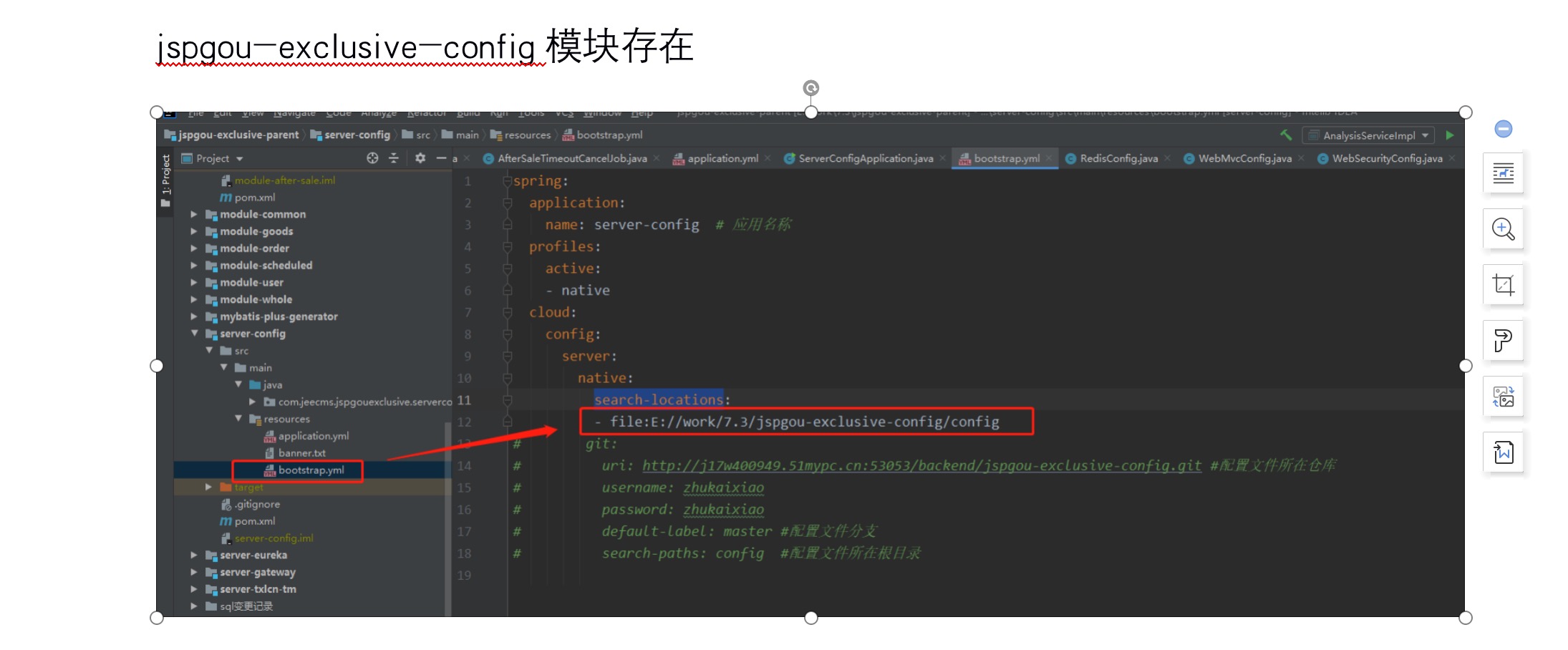 确定配置文件\server-config\src\main\resources\bootstrap.yml中的search-locations对应的jspgou-exclusive-config模块存在