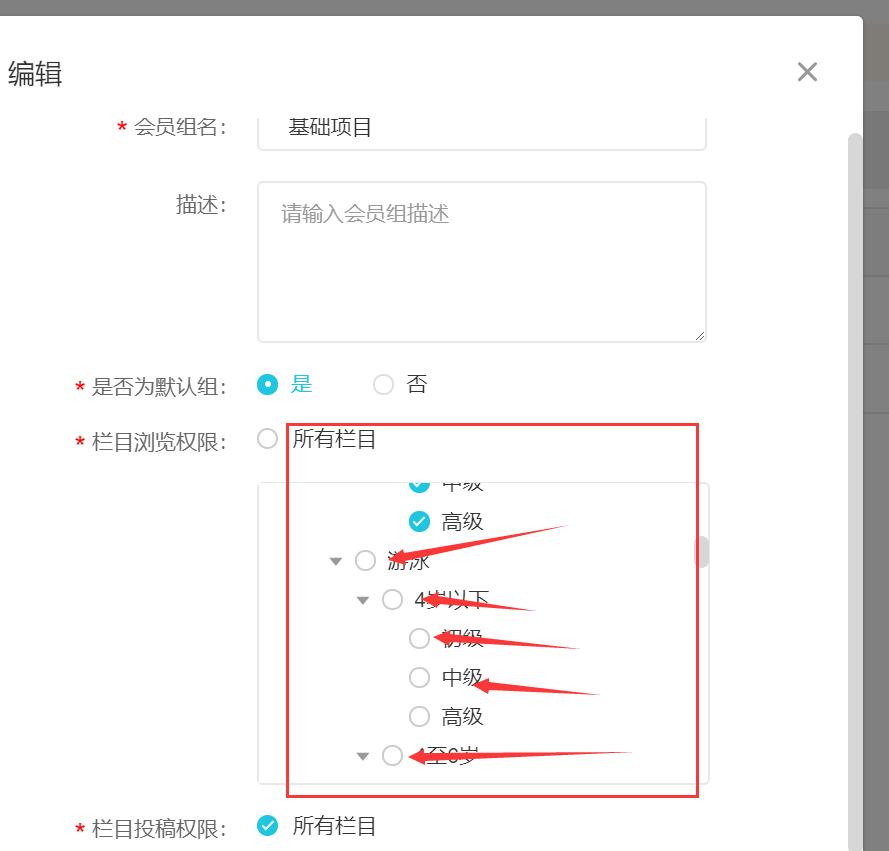 栏目下只能设置登录浏览权限,不能设置用户组浏览权限吧
