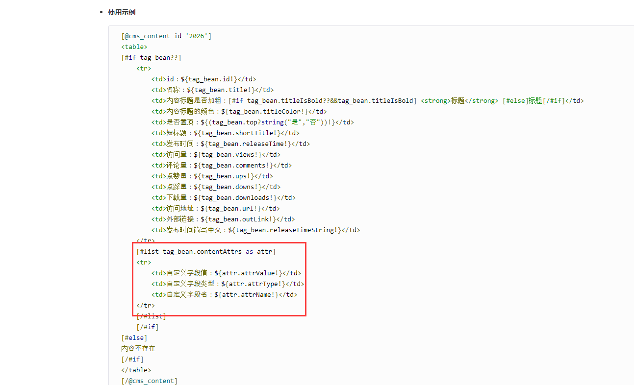 您好,您可以看看前台标签文档,里面有自定义标签的调用方法解答。举个例子,如果是内容模型,那就去看文档的内容详情那块