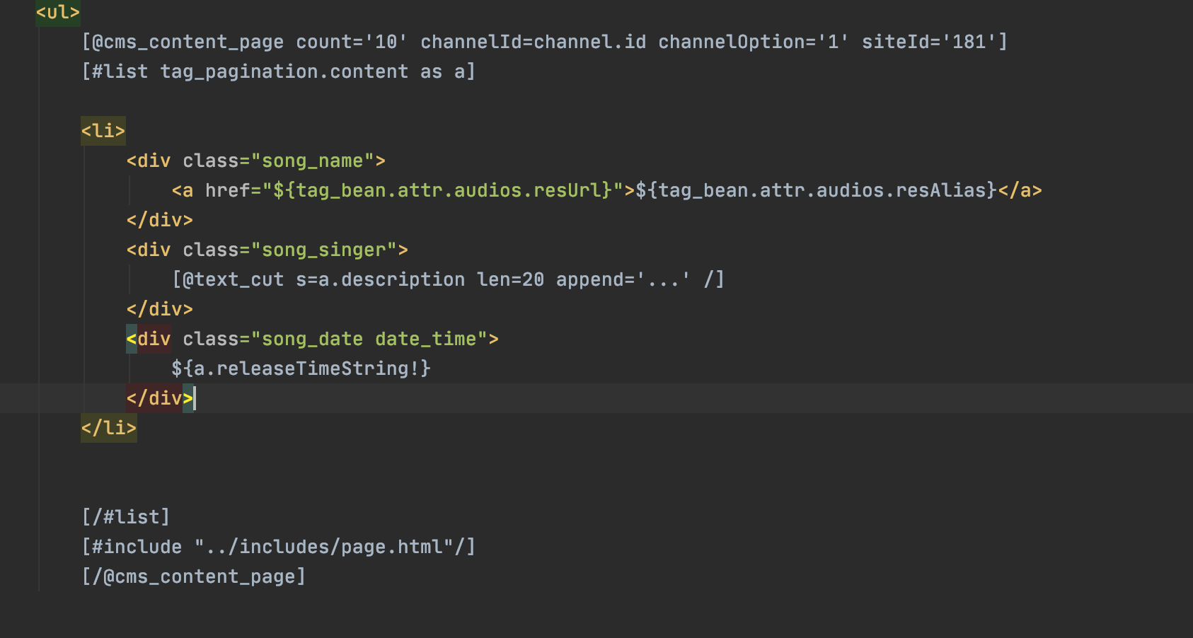 [@cms_content_page count='10' channelId=channel.id channelOption='1' siteId='181'] [#list tag_pagination.content as a] <li> <div class="song_name"> <a href="${a.attr.audios.resUrl}">${a.attr.audios.resAlias}</a> </div> <div class="song_singer"> [@text_cut s=a.description len=20 append='...' /] </div> <div class="song_date date_time"> ${a.releaseTimeString!} </div> </li> [/#list] [#include "../includes/page.html"/] [/@cms_content_page] </ul> |