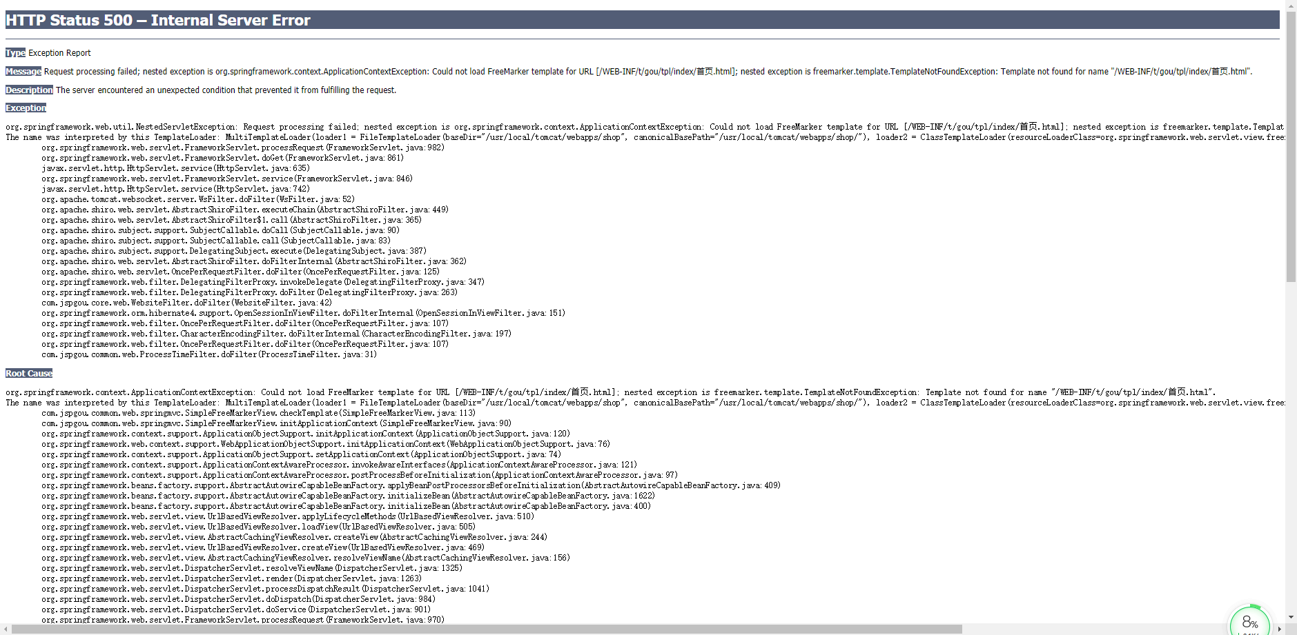 The name was interpreted by this TemplateLoader: MultiTemplateLoader(loader1 = FileTemplateLoader(baseDir="/usr/local/tomcat/webapps/shop", canonicalBasePath="/usr/local/tomcat/webapps/shop/"), loader2 = ClassTemplateLoader(resourceLoaderClass=org.springframework.web.servlet.view.freemarker.FreeMarkerConfigurer, basePackagePath="" /* relatively to resourceLoaderClass pkg */)).] with root cause freemarker.template.TemplateNotFoundException: Template not found for name "/WEB-INF/t/gou/tpl/index/首页.html". The name was interpreted by this TemplateLoader: MultiTemplateLoader(loader1 = FileTemplateLoader(baseDir="/usr/local/tomcat/webapps/shop", canonicalBasePath="/usr/local/tomcat/webapps/shop/"), loader2 = ClassTemplateLoader(resourceLoaderClass=org.springframework.web.servlet.view.freemarker.FreeMarkerConfigurer, basePackagePath="" /* relatively to resourceLoaderClass pkg */)). at freemarker.template.Configuration.getTemplate(Configuration.java:2485) at freemarker.template.Configuration.getTemplate(Configuration.java:2287) at com.jspgou.common.web.springmvc.SimpleFreeMarkerView.checkTemplate(SimpleFreeMarkerView.java:107) at com.jspgou.common.web.springmvc.SimpleFreeMarkerView.initApplicationContext(SimpleFreeMarkerView.java:90) at org.springframework.context.support.ApplicationObjectSupport.initApplicationContext(ApplicationObjectSupport.java:120) at org.springframework.web.context.support.WebApplicationObjectSupport.initApplicationContext(WebApplicationObjectSupport.java:76) at org.springframework.context.support.ApplicationObjectSupport.setApplicationContext(ApplicationObjectSupport.java:74) at org.springframework.context.support.ApplicationContextAwareProcessor.invokeAwareInterfaces(ApplicationContextAwareProcessor.java:121) at org.springframework.context.support.ApplicationContextAwareProcessor.postProcessBeforeInitialization(ApplicationContextAwareProcessor.java:97) at org.springframework.beans.factory.support.AbstractAutowireCapableBeanFactory.applyBeanPostProcessorsBeforeInitialization(AbstractAutowireCapableBeanFactory.java:409) at org.springframework.beans.factory.support.AbstractAutowireCapableBeanFactory.initializeBean(AbstractAutowireCapableBeanFactory.java:1622) at org.springframework.beans.factory.support.AbstractAutowireCapableBeanFactory.initializeBean(AbstractAutowireCapableBeanFactory.java:400) at org.springframework.web.servlet.view.UrlBasedViewResolver.applyLifecycleMethods(UrlBasedViewResolver.java:510) at org.springframework.web.servlet.view.UrlBasedViewResolver.loadView(UrlBasedViewResolver.java:505) at org.springframework.web.servlet.view.AbstractCachingViewResolver.createView(AbstractCachingViewResolver.java:244) at org.springframework.web.servlet.view.UrlBasedViewResolver.createView(UrlBasedViewResolver.java:469) at org.springframework.web.servlet.view.AbstractCachingViewResolver.resolveViewName(AbstractCachingViewResolver.java:156) at org.springframework.web.servlet.DispatcherServlet.resolveViewName(DispatcherServlet.java:1325) at org.springframework.web.servlet.DispatcherServlet.render(DispatcherServlet.java:1263) at org.springframework.web.servlet.DispatcherServlet.processDispatchResult(DispatcherServlet.java:1041) at org.springframework.web.servlet.DispatcherServlet.doDispatch(DispatcherServlet.java:984) at org.springframework.web.servlet.DispatcherServlet.doService(DispatcherServlet.java:901) at org.springframework.web.servlet.FrameworkServlet.processRequest(FrameworkServlet.java:970) at org.springframework.web.servlet.FrameworkServlet.doGet(FrameworkServlet.java:861) at javax.servlet.http.HttpServlet.service(HttpServlet.java:635) at org.springframework.web.servlet.FrameworkServlet.service(FrameworkServlet.java:846) at javax.servlet.http.HttpServlet.service(HttpServlet.java:742) at org.apache.catalina.core.ApplicationFilterChain.internalDoFilter(ApplicationFilterChain.java:231) at org.apache.catalina.core.ApplicationFilterChain.doFilter(ApplicationFilterChain.java:166) at org.apache.tomcat.websocket.server.WsFilter.doFilter(WsFilter.java:52) at org.apache.catalina.core.ApplicationFilterChain.internalDoFilter(ApplicationFilterChain.java:193) at org.apache.catalina.core.ApplicationFilterChain.doFilter(ApplicationFilterChain.java:166) at org.apache.shiro.web.servlet.AbstractShiroFilter.executeChain(AbstractShiroFilter.java:449) at org.apache.shiro.web.servlet.AbstractShiroFilter$1.call(AbstractShiroFilter.java:365) at org.apache.shiro.subject.support.SubjectCallable.doCall(SubjectCallable.java:90) at org.apache.shiro.subject.support.SubjectCallable.call(SubjectCallable.java:83) at org.apache.shiro.subject.support.DelegatingSubject.execute(DelegatingSubject.java:387) at org.apache.shiro.web.servlet.AbstractShiroFilter.doFilterInternal(AbstractShiroFilter.java:362) at org.apache.shiro.web.servlet.OncePerRequestFilter.doFilter(OncePerRequestFilter.java:125) at org.springframework.web.filter.DelegatingFilterProxy.invokeDelegate(DelegatingFilterProxy.java:347) at org.springframework.web.filter.DelegatingFilterProxy.doFilter(DelegatingFilterProxy.java:263) at org.apache.catalina.core.ApplicationFilterChain.internalDoFilter(ApplicationFilterChain.java:193) at org.apache.catalina.core.ApplicationFilterChain.doFilter(ApplicationFilterChain.java:166) at com.jspgou.core.web.WebsiteFilter.doFilter(WebsiteFilter.java:42) at org.apache.catalina.core.ApplicationFilterChain.internalDoFilter(ApplicationFilterChain.java:193) at org.apache.catalina.core.ApplicationFilterChain.doFilter(ApplicationFilterChain.java:166) at org.springframework.orm.hibernate4.support.OpenSessionInViewFilter.doFilterInternal(OpenSessionInViewFilter.java:151) at org.springframework.web.filter.OncePerRequestFilter.doFilter(OncePerRequestFilter.java:107) at org.apache.catalina.core.ApplicationFilterChain.internalDoFilter(ApplicationFilterChain.java:193) at org.apache.catalina.core.ApplicationFilterChain.doFilter(ApplicationFilterChain.java:166) at org.springframework.web.filter.CharacterEncodingFilter.