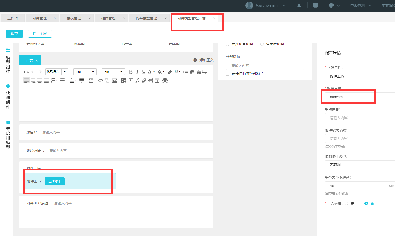 内容模型里附件上传字段检查下是不是和上面一样 attachments