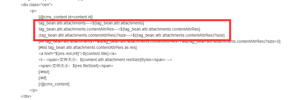 [@cms_content id=content.id] <ol style="list-style-type:decimal;font-size:12px;line-height:200%;"> <li style="border-bottom:1px dashed #dedede;margin-bottom:10px;line-height:30px;">附件列表:</li> [#if tag_bean.attr.attachments??&&tag_bean.attr.attachments.contentAttrRes??&&(tag_bean.attr.attachments.contentAttrRes)?size>0] [#list tag_bean.attr.attachments.contentAttrRes as res] <li style="list-style-type:decimal;"><a href="${res.resUrl!}">【${res.resAlias!}】</a> <span style="display:inline-block;float:right;margin-left:50px;">大小:${res.fileSize!}</span></li> [/#list] </ol>[/#if] [/@cms_content] |