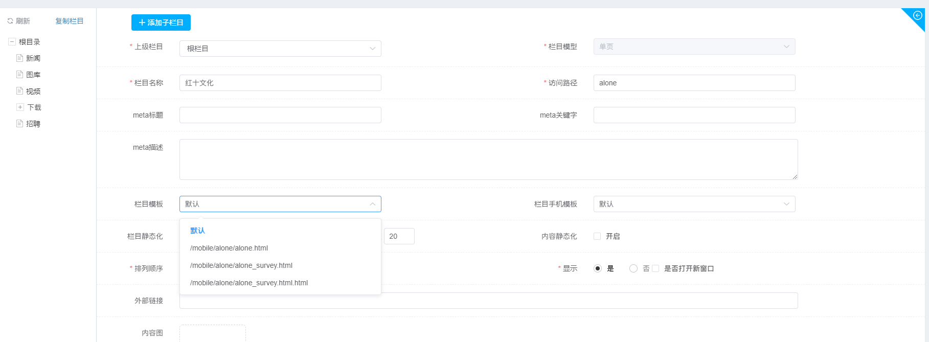 ![]() ![]() 加个红十文化栏目,他没到左边根目录下,然后我在alone里面加了我自己写的模板然后没识别出来 |