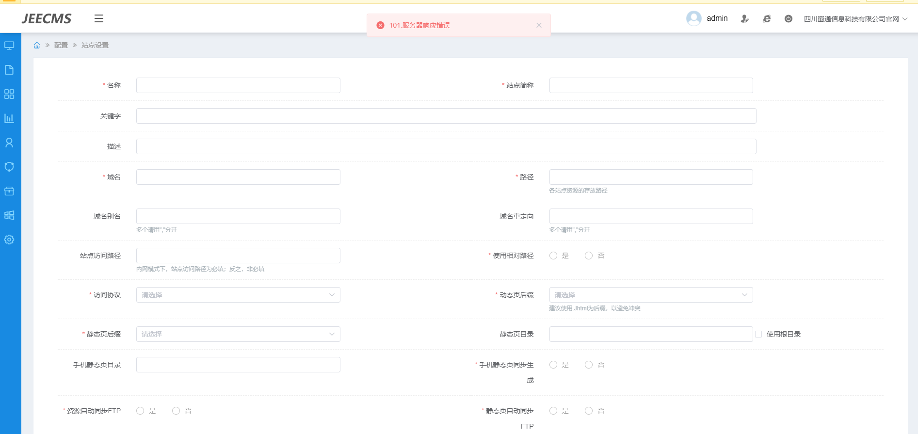 后台可以看到栏目和发布的内容数据,点击到站点设置就弹出:101:服务器响应错误;