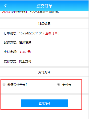 点击按钮的页面是有的,就是这个 ![]() 选中支付宝之后之后就跳转到了/pay.jspx页面,没有再继续跳转到支付宝的页面,pc端是跳到/pay.jspx页面之后,然后就跳到了支付宝的页面即这个页面 ![]() |