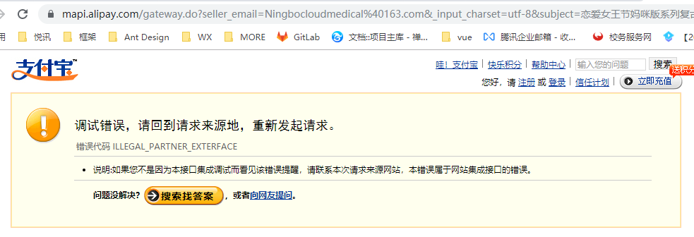 您这个配置信息是不是写错了 您可以去看下我们演示站的支付功能 在配置正确的时候是可以使用的