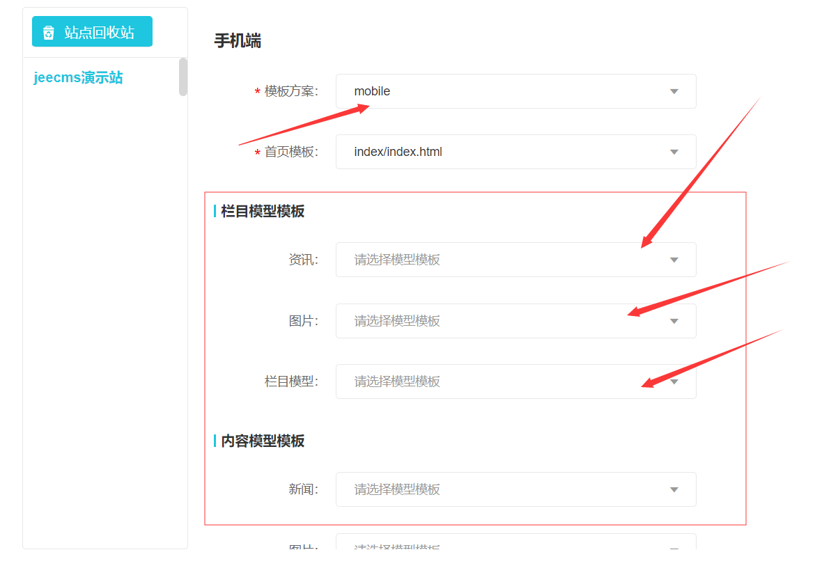 在站点扩展属性中,手机模板我设置为moblie;无法获取到栏目模板和内容模板等:如下图所示: