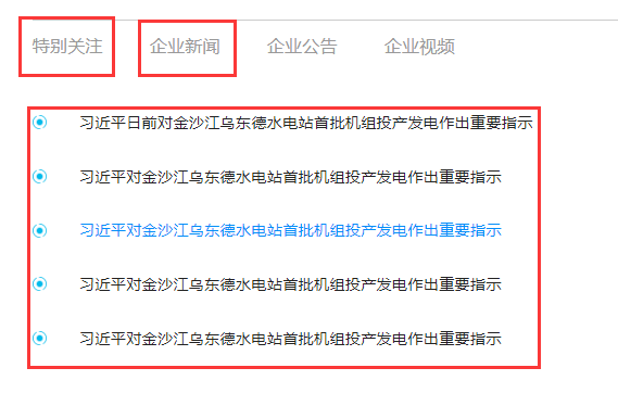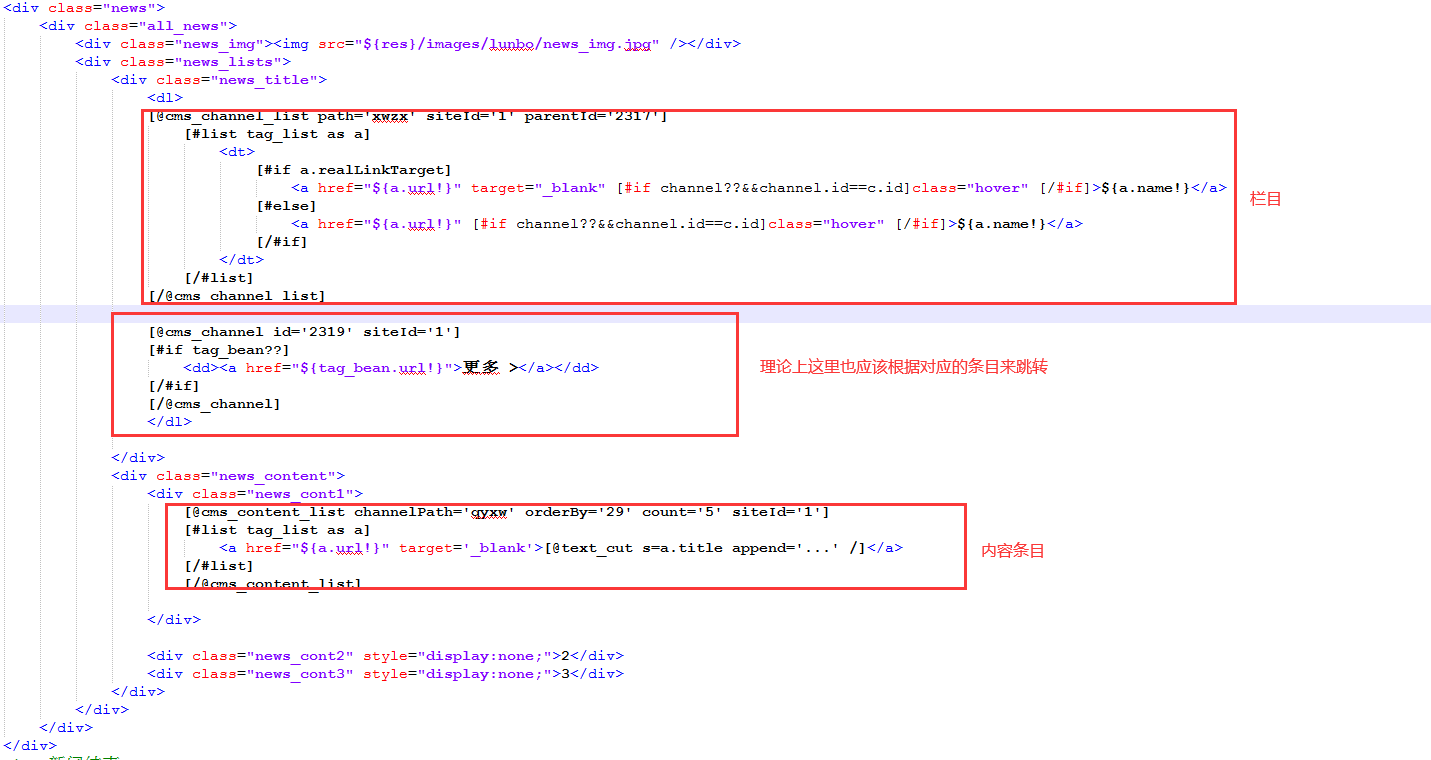 <div class="news"> <div class="all_news"> <div class="news_img"><img src="${res}/images/lunbo/news_img.jpg" /></div> <div class="news_lists"> <div class="news_title"> <dl> [@cms_channel_list path='xwzx' siteId='1' parentId='2317'] [#list tag_list as a] <dt> [#if a.realLinkTarget] <a href="${a.url!}" target="_blank" [#if channel??&&channel.id==c.id]class="hover" [/#if]>${a.name!}</a> [#else] <a href="${a.url!}" [#if channel??&&channel.id==c.id]class="hover" [/#if]>${a.name!}</a> [/#if] </dt> [/#list] [/@cms_channel_list] [@cms_channel id='2319' siteId='1'] [#if tag_bean??] <dd><a href="${tag_bean.url!}">更多 ></a></dd> [/#if] [/@cms_channel] </dl> </div> <div class="news_content"> <div class="news_cont1"> [@cms_content_list channelPath='qyxw' orderBy='29' count='5' siteId='1'] [#list tag_list as a] <a href="${a.url!}" target='_blank'>[@text_cut s=a.title append='...' /]</a> [/#list] [/@cms_content_list] </div> <div class="news_cont2" style="display:none;">2</div> <div class="news_cont3" style="display:none;">3</div> </div> </div> </div> </div> |