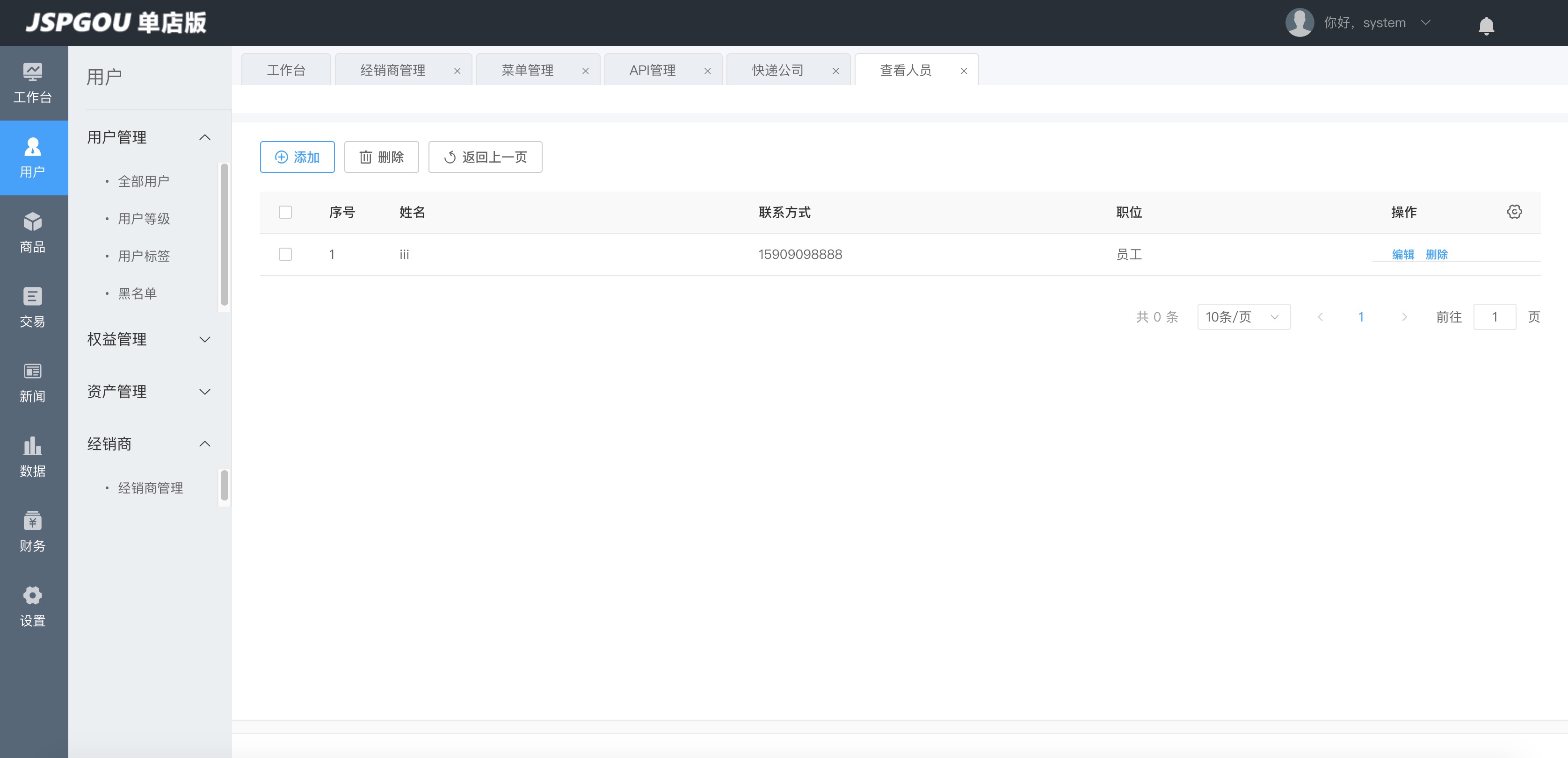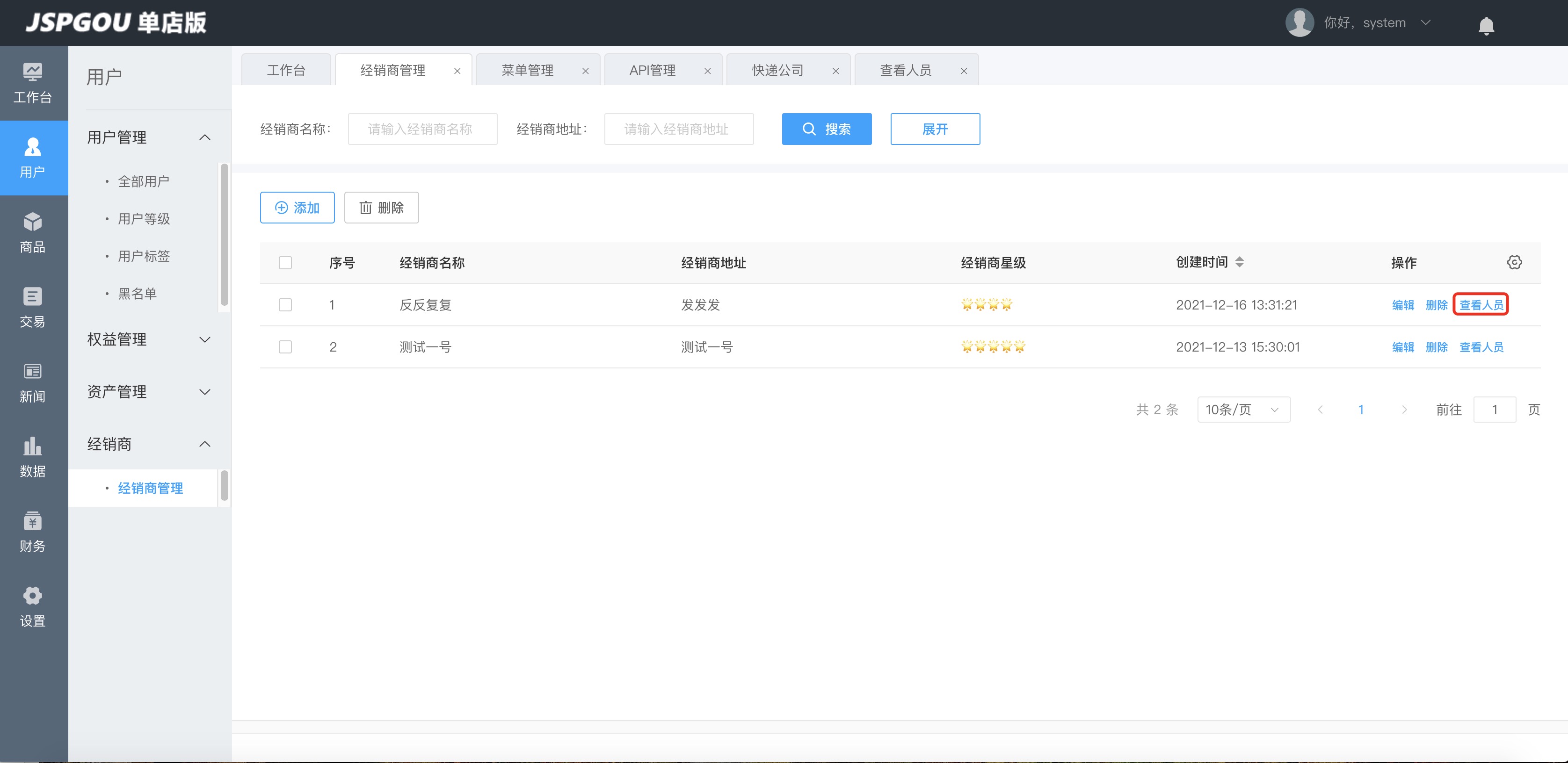 ![]() ![]() 首先是经销商管理页面,然后有一个查看人员的按钮,点击按钮打开该经销商下的所有人员,就这个页面是不需要分页的 |