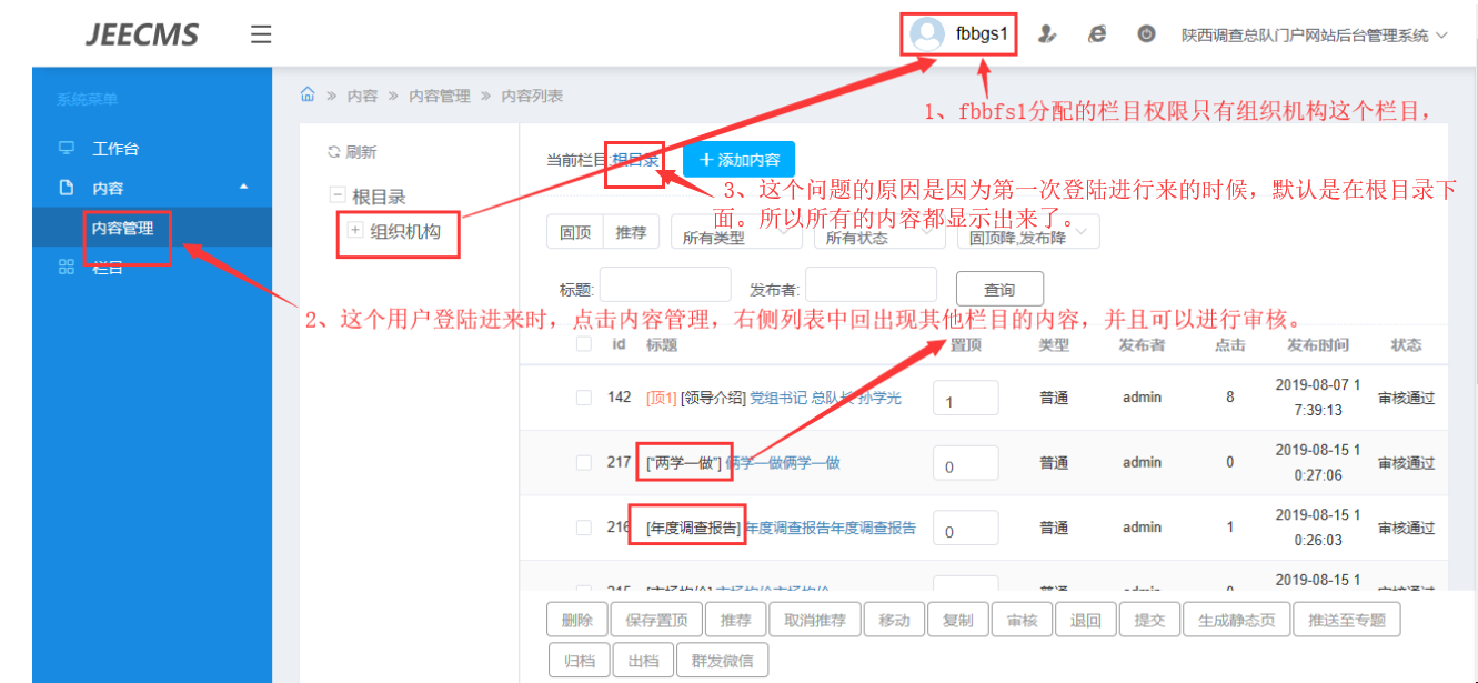 你好版主,发现v9.3有个权限的bug,后台admin新建一个用户,并分配相关角色权限以及栏目权限,此时登陆这个用户,点击内容管理,右侧列表页,默认存在于根目录下,这时,所有的内容都可以看到并且进行修改,那么分配的栏目权限就没有作用了,详情如图:当分配了栏目权限后,用户登陆系统后,点击内容管理,默认当前位置处于分配给它的第一个栏目,而不是跟栏目,这样用户就只能查看和审核自己栏目下的数据。
