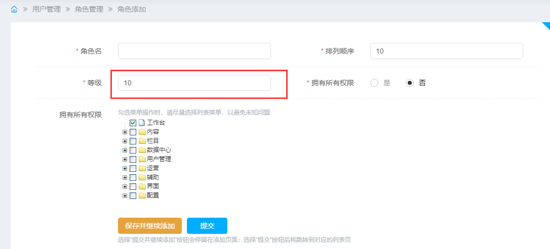 回复第37楼  角色管理 等级默认是10.但是增加会报错。这个等级是1的时候才能新增成功。