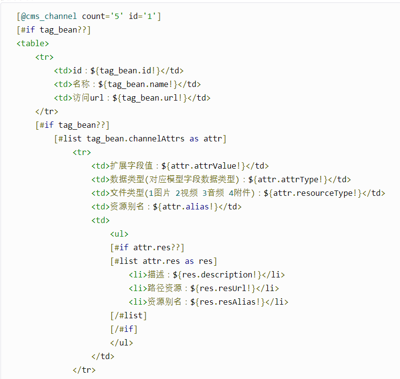 [@cms_channel id="2102"] [#if tag_bean??] ${tag_bean.name} [#list tag_bean.channelAttrs as attr] <tr class="ceshih"> <td> <ul> [#if attr.res??] [#list attr.res as res] <li >${res.iconUrl}</li> [/#list] [/#if] </ul> </td> </tr> [/#list] [/#if] [/@cms_channel] 是直接这样写??? [@cms_channel id="2102"] ${res.iconUrl} [/@cms_channel] |
