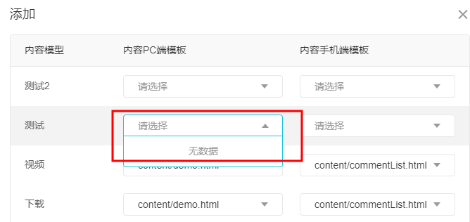 如下图,新建内容模型、新建栏目后无法给栏目设置内容模板