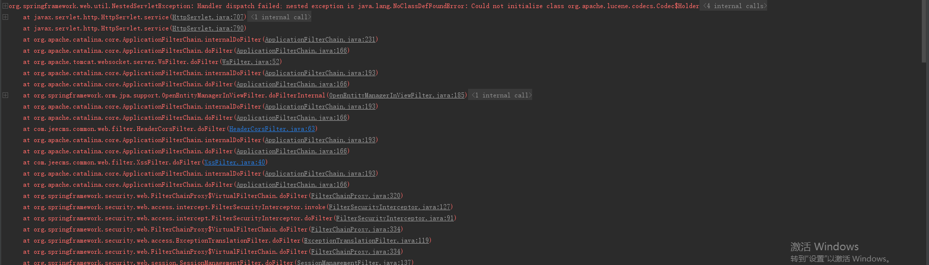 org.springframework.web.util.NestedServletException: Handler dispatch failed; nested exception is java.lang.NoClassDefFoundError: Could not initialize class org.apache.lucene.codecs.Codec$Holder at org.springframework.web.servlet.DispatcherServlet.doDispatch(DispatcherServlet.java:1006) at org.springframework.web.servlet.DispatcherServlet.doService(DispatcherServlet.java:925) at org.springframework.web.servlet.FrameworkServlet.processRequest(FrameworkServlet.java:981) at org.springframework.web.servlet.FrameworkServlet.doPost(FrameworkServlet.java:884) at javax.servlet.http.HttpServlet.service(HttpServlet.java:707) at org.springframework.web.servlet.FrameworkServlet.service(FrameworkServlet.java:858) at javax.servlet.http.HttpServlet.service(HttpServlet.java:790) at org.apache.catalina.core.ApplicationFilterChain.internalDoFilter(ApplicationFilterChain.java:231) at org.apache.catalina.core.ApplicationFilterChain.doFilter(ApplicationFilterChain.java:166) at org.apache.tomcat.websocket.server.WsFilter.doFilter(WsFilter.java:52) at org.apache.catalina.core.ApplicationFilterChain.internalDoFilter(ApplicationFilterChain.java:193) at org.apache.catalina.core.ApplicationFilterChain.doFilter(ApplicationFilterChain.java:166) at org.springframework.orm.jpa.support.OpenEntityManagerInViewFilter.doFilterInternal(OpenEntityManagerInViewFilter.java:185) at org.springframework.web.filter.OncePerRequestFilter.doFilter(OncePerRequestFilter.java:107) at org.apache.catalina.core.ApplicationFilterChain.internalDoFilter(ApplicationFilterChain.java:193) at org.apache.catalina.core.ApplicationFilterChain.doFilter(ApplicationFilterChain.java:166) at com.jeecms.common.web.filter.HeaderCorsFilter.doFilter(HeaderCorsFilter.java:63) at org.apache.catalina.core.ApplicationFilterChain.internalDoFilter(ApplicationFilterChain.java:193) at org.apache.catalina.core.ApplicationFilterChain.doFilter(ApplicationFilterChain.java:166) at com.jeecms.common.web.filter.XssFilter.doFilter(XssFilter.java:40) at org.apache.catalina.core.ApplicationFilterChain.internalDoFilter(ApplicationFilterChain.java:193) at org.apache.catalina.core.ApplicationFilterChain.doFilter(ApplicationFilterChain.java:166) at org.springframework.security.web.FilterChainProxy$VirtualFilterChain.doFilter(FilterChainProxy.java:320) at org.springframework.security.web.access.intercept.FilterSecurityInterceptor.invoke(FilterSecurityInterceptor.java:127) at org.springframework.security.web.access.intercept.FilterSecurityInterceptor.doFilter(FilterSecurityInterceptor.java:91) at org.springframework.security.web.FilterChainProxy$VirtualFilterChain.doFilter(FilterChainProxy.java:334) at org.springframework.security.web.access.ExceptionTranslationFilter.doFilter(ExceptionTranslationFilter.java:119) at org.springframework.security.web.FilterChainProxy$VirtualFilterChain.doFilter(FilterChainProxy.java:334) at org.springframework.security.web.session.SessionManagementFilter.doFilter(SessionManagementFilter.java:137) at org.springframework.security.web.FilterChainProxy$VirtualFilterChain.doFilter(FilterChainProxy.java:334) at org.springframework.security.web.authentication.AnonymousAuthenticationFilter.doFilter(AnonymousAuthenticationFilter.java:111) at org.springframework.security.web.FilterChainProxy$VirtualFilterChain.doFilter(FilterChainProxy.java:334) at org.springframework.security.web.authentication.rememberme.RememberMeAuthenticationFilter.doFilter(RememberMeAuthenticationFilter.java:158) at org.springframework.security.web.FilterChainProxy$VirtualFilterChain.doFilter(FilterChainProxy.java:334) at org.springframework.security.web.servletapi.SecurityContextHolderAwareRequestFilter.doFilter(SecurityContextHolderAwareRequestFilter.java:170) at org.springframework.security.web.FilterChainProxy$VirtualFilterChain.doFilter(FilterChainProxy.java:334) at org.springframework.security.web.savedrequest.RequestCacheAwareFilter.doFilter(RequestCacheAwareFilter.java:63) at org.springframework.security.web.FilterChainProxy$VirtualFilterChain.doFilter(FilterChainProxy.java:334) at org.springframework.security.web.authentication.AbstractAuthenticationProcessingFilter.doFilter(AbstractAuthenticationProcessingFilter.java:200) at org.springframework.security.web.FilterChainProxy$VirtualFilterChain.doFilter(FilterChainProxy.java:334) at com.jeecms.component.AuthenticationTokenFilter.doFilter(AuthenticationTokenFilter.java:52) at org.springframework.security.web.FilterChainProxy$VirtualFilterChain.doFilter(FilterChainProxy.java:334) at org.springframework.security.web.authentication.logout.LogoutFilter.doFilter(LogoutFilter.java:116) at org.springframework.security.web.FilterChainProxy$VirtualFilterChain.doFilter(FilterChainProxy.java:334) at org.springframework.security.web.header.HeaderWriterFilter.doFilterInternal(HeaderWriterFilter.java:74) at org.springframework.web.filter.OncePerRequestFilter.doFilter(OncePerRequestFilter.java:107) at org.springframework.security.web.FilterChainProxy$VirtualFilterChain.doFilter(FilterChainProxy.java:334) at org.springframework.security.web.context.SecurityContextPersistenceFilter.doFilter(SecurityContextPersistenceFilter.java:105) at org.springframework.security.web.FilterChainProxy$VirtualFilterChain.doFilter(FilterChainProxy.java:334) at org.springframework.security.web.context.request.async.WebAsyncManagerIntegrationFilter.doFilterInternal(WebAsyncManagerIntegrationFilter.java:56) at org.springframework.web.filter.OncePerRequestFilter.doFilter(OncePerRequestFilter.java:107) at org.springframework.security.web.FilterChainProxy$VirtualFilterChain.doFilter(FilterChainProxy.java:334) at org.springframework.security.web.FilterChainProxy.doFilterInternal(FilterChainProxy.java:215) at org.springframework.security.web.FilterChainProxy.doFilter(FilterChainProxy.java:178) at org.springframework.web.filter.DelegatingFilterProxy.invokeDelegate(DelegatingFilterProxy.java:357) at org.springframework.web.filter.DelegatingFilterProxy.doFilter(DelegatingFilt