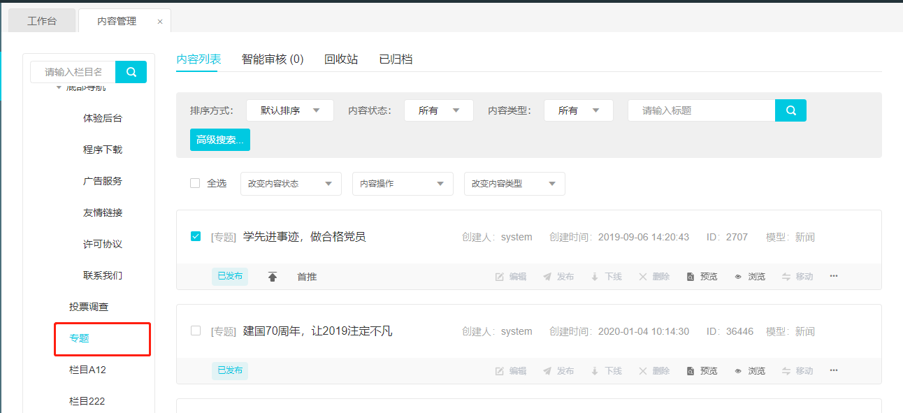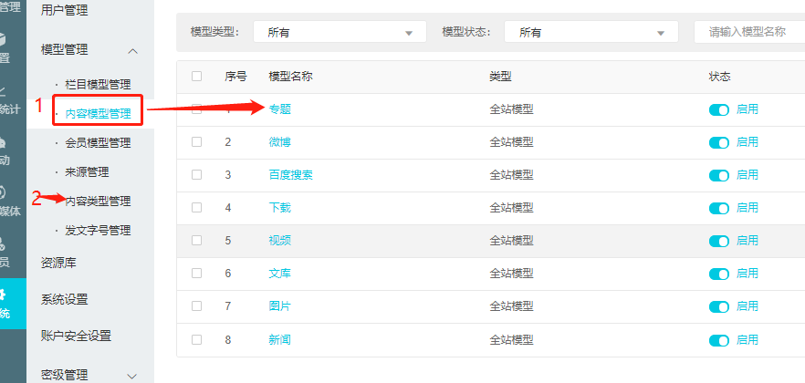 抱歉您这段我没太理解 但是类型就是您标注的2那个 这个用在内容管理里的 比如您要一个配置一个内容的类型那么只要您在内容类型管理里先加了这个类型后去内容管理下通过更多操作就可以选择到这个类型了 |