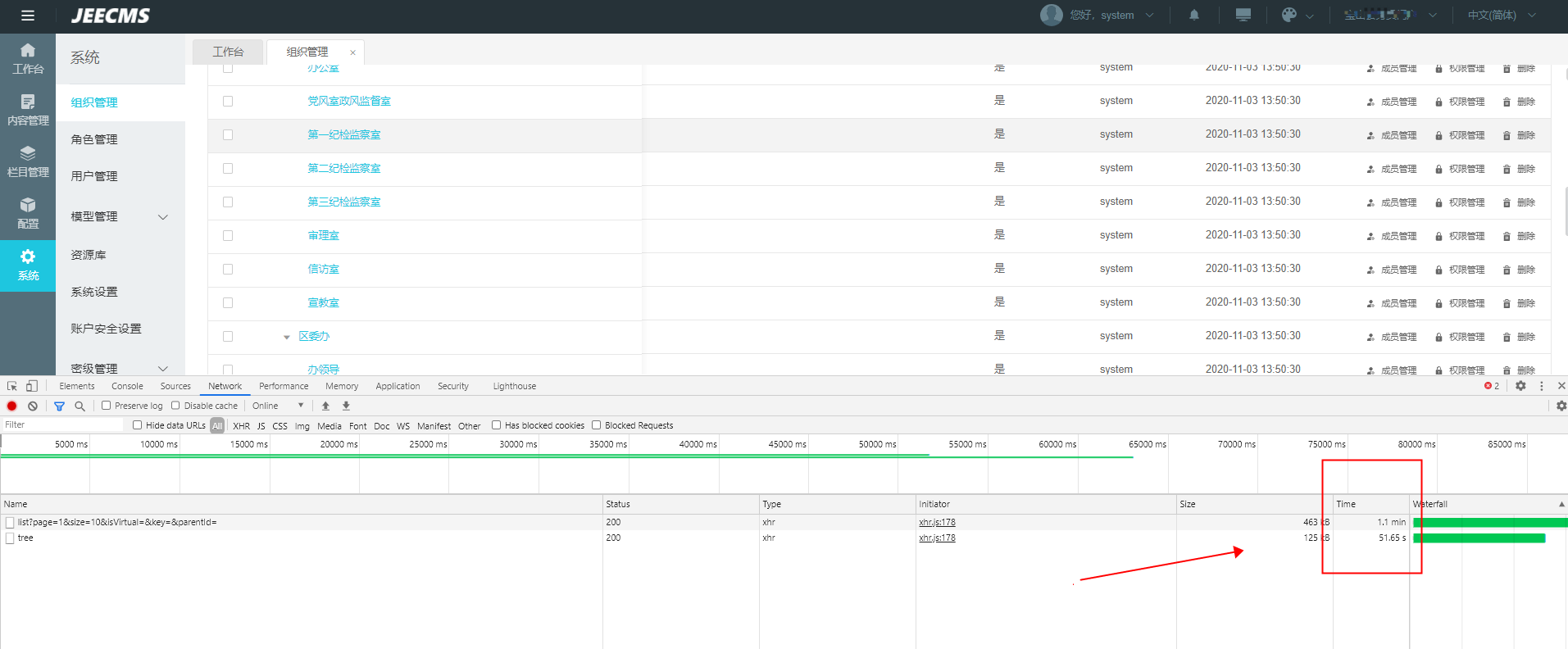 你好,这个组织管理页面加载速度太慢了,几百条的组织加载出来要一俩分钟,加载出来后页面也点不了了,用户体验特别不好,一个接口后台打印了几十条查询sql,加载两分钟这个模块就没用了,可以提供下修复优化包吗,我是jeecmsx1.4和jeecmsx1.5都出现这样的问题