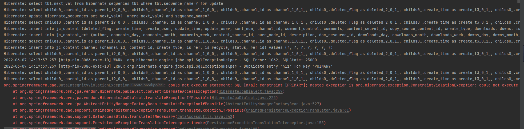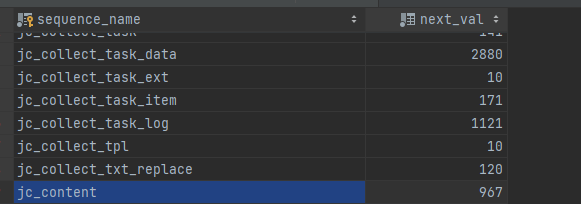 hibernate_sequences sequence_name 等于这个 jc_content 的值调整成jc_content表id最大值+20