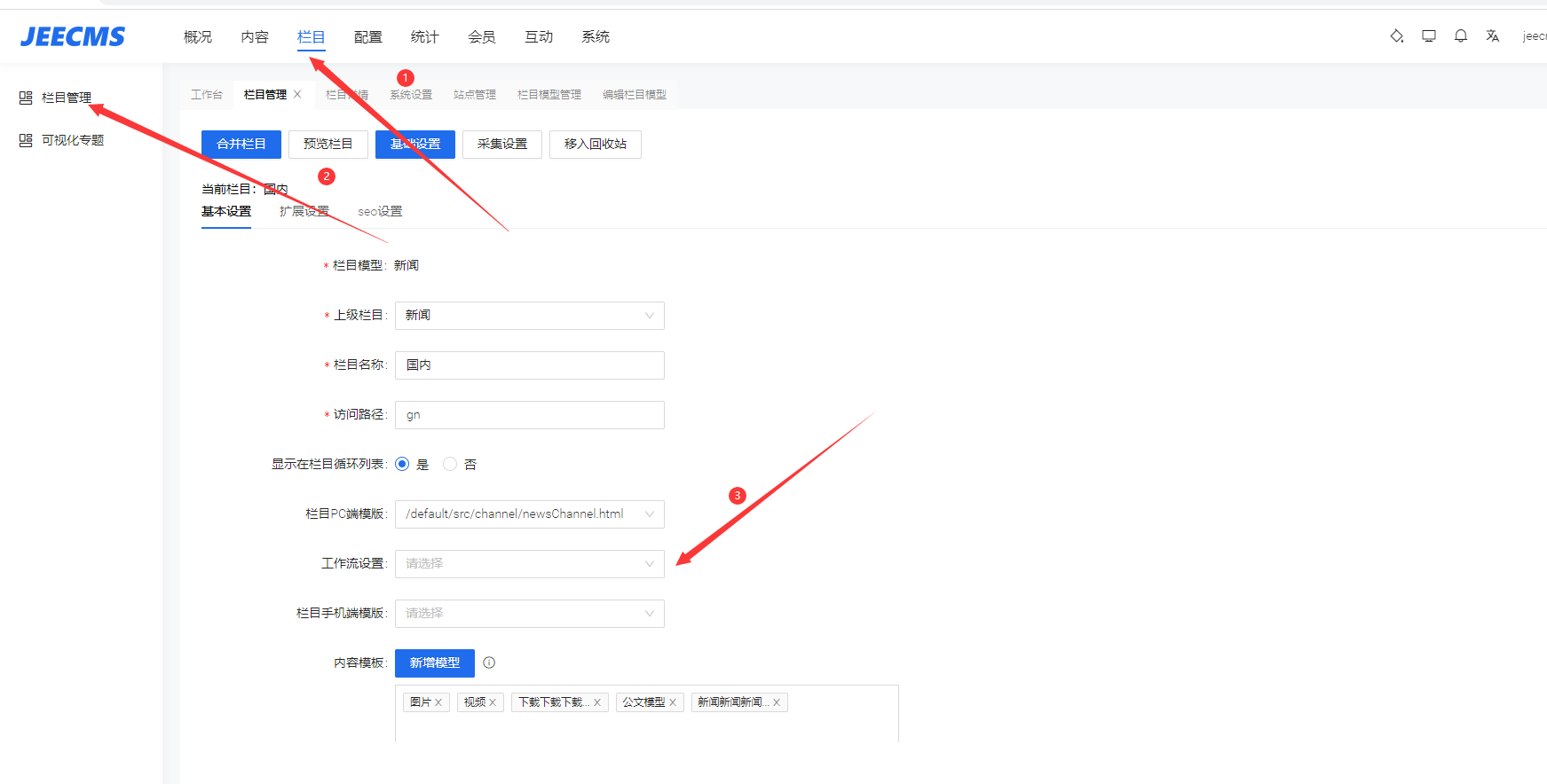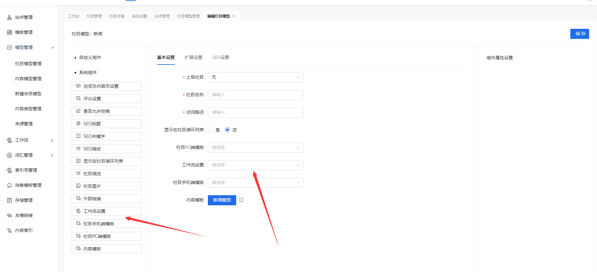 这里工作流创建完成后需要在栏目那边应用下  如果栏目没有工作流设置字段需要 到栏目模型的模型字段设置里面去把这个字段给放上去