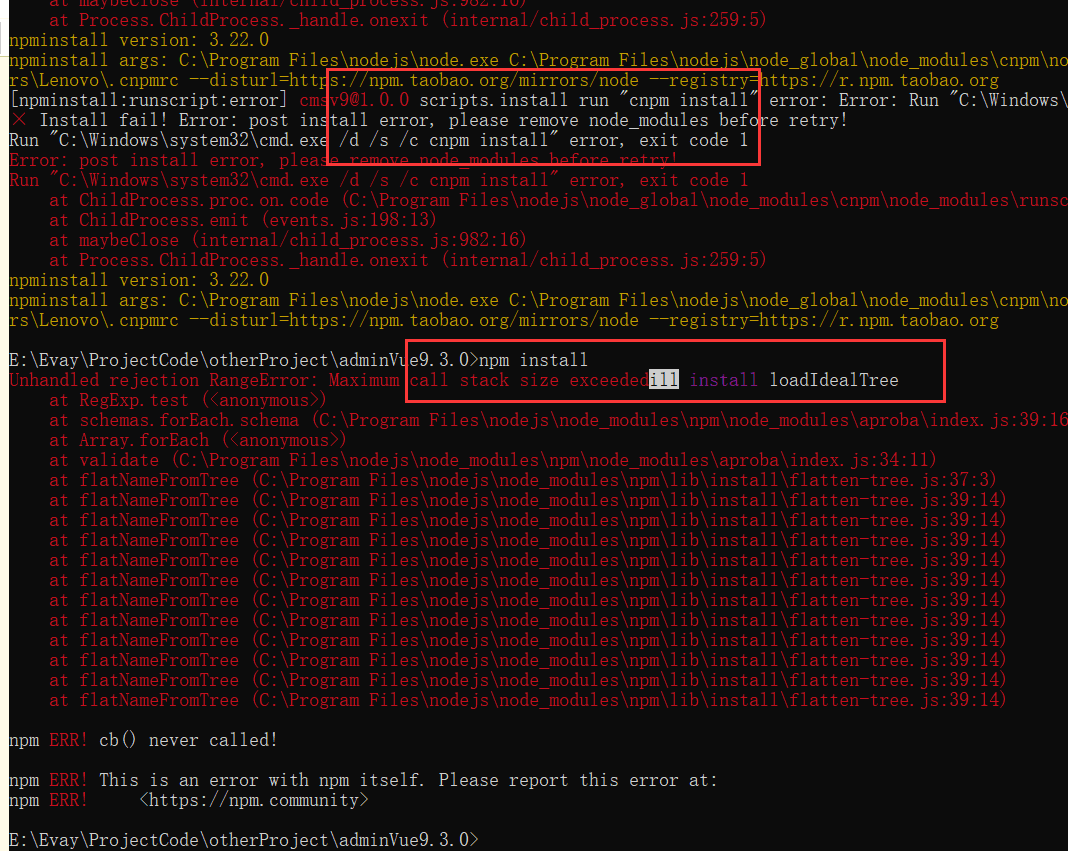 而且在生成node_modules文件夹时,使用npm install 和cnpm install 两种命令都会出现报错