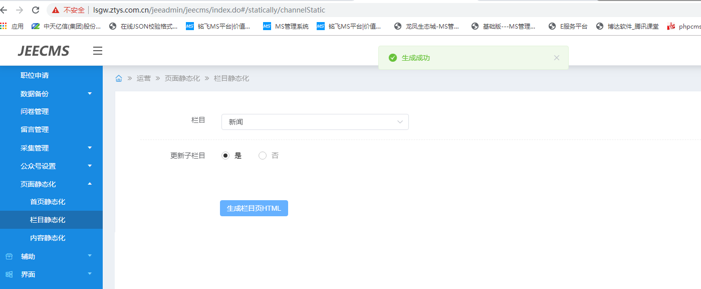 生成后去看下您的项目文件里有没有这个静态页的栏目首页 再有的情况下看下是不是访问的地址不对