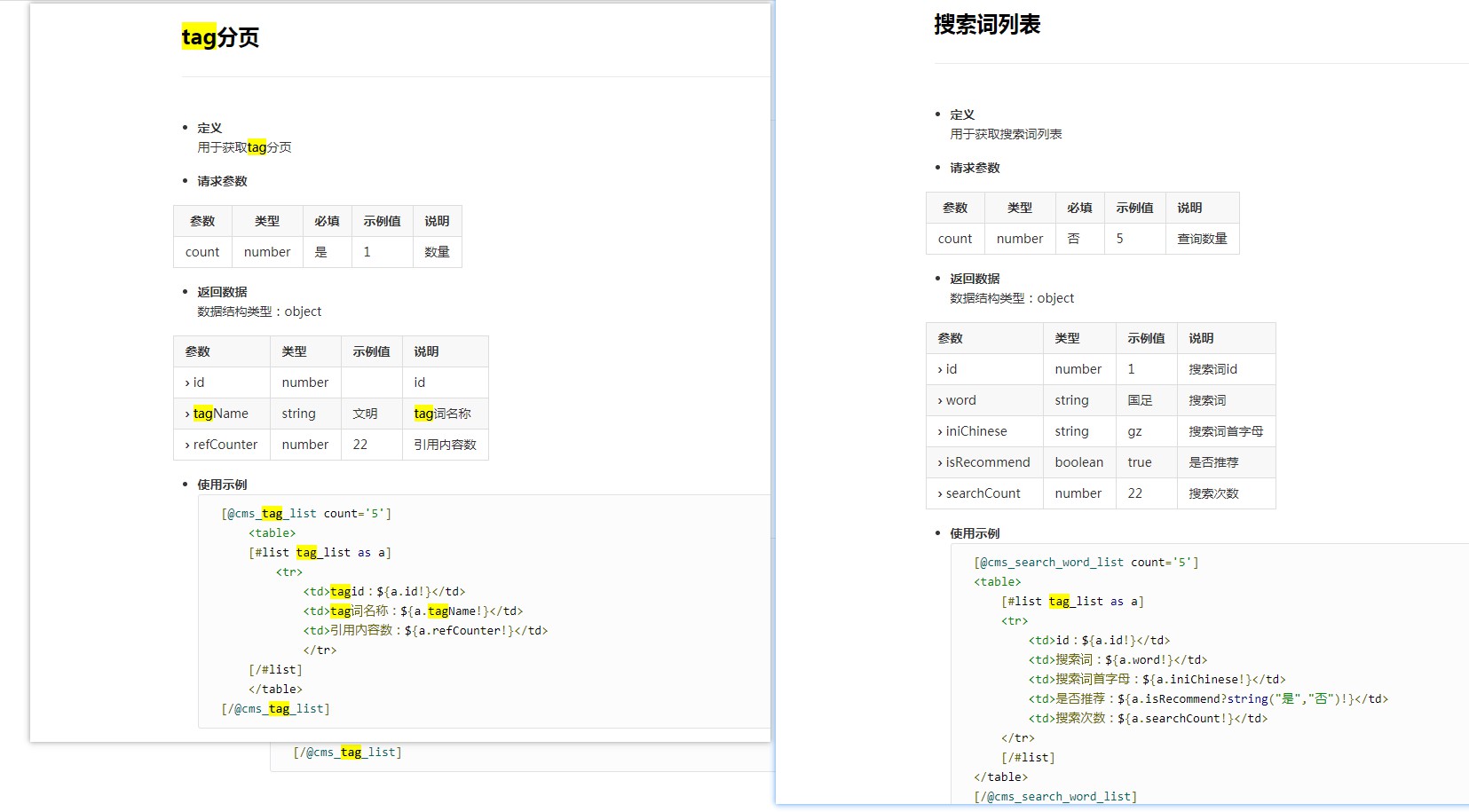 [@cms_tag_list count='5'] <table> [#list tag_list as a] <tr> <td>tagid:${a.id!}</td> <td>tag词名称:${a.tagName!}</td> <td>引用内容数:${a.refCounter!}</td> </tr> [/#list] </table> [/@cms_tag_list] 详细的您可以参考前台标签文档 ![]() |
